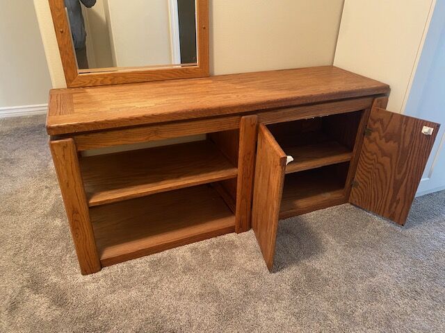 VenmoSolid oak credenza for entry or office or sideboard for dining room, This lovely piece of furnature is as new. It features an open area with an adjustable shelf and closed area behind two doors also with an adjustable shelf. Also included is a framed in oak beveled glass wlll mount mirror. Its dimensions are 66 inches long, 19.5 inches deep and 30 inches high.