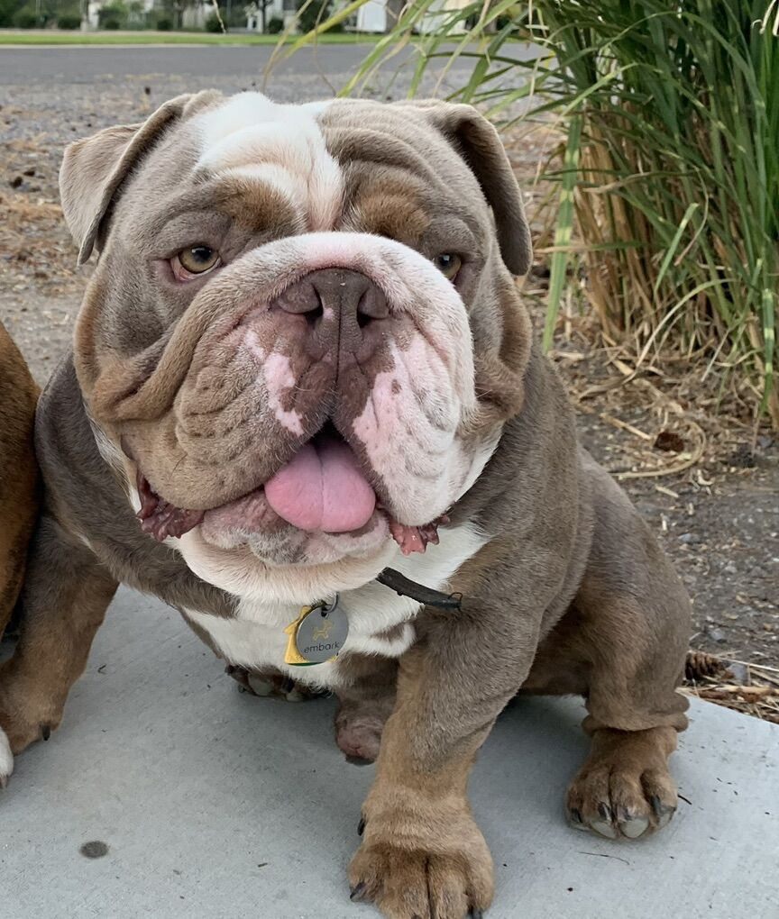 Leo is a true lilac, carrying dd bb NN atat (Chocolate, Black, Blue and the dilute variant). In addition, he carries BOTH Tri variants and shows them fantastically! Not only will he give a HUGE variety to the color of your program, but will also help structurally. Leo is a Kodiak/Frankie decedent; some of the best colored bulldogs out there.