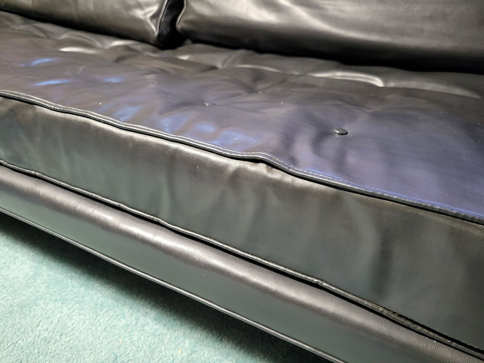 This is a gorgeous vinyl sofa. It is in very good condition. Walnut frame and legs. The vinyl is still supple and the cushions are not hard. There is a 5 inch area on the back bottom cushion that the stitching has seperated. See pics. Overall it is in excellent condition for it's age. Strong and sturdy. Wonderful addition to any mid century collection.