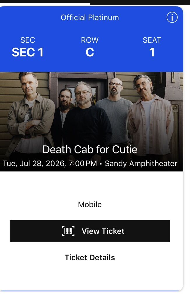 Venmo2 tickets to Death Cab, almost front row!!! I switched nights and friends can’t go with us. Row C, seats 1&3. Don’t let the seat numbers fool you, they are next to each other.