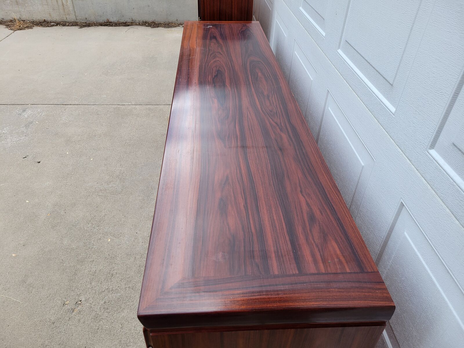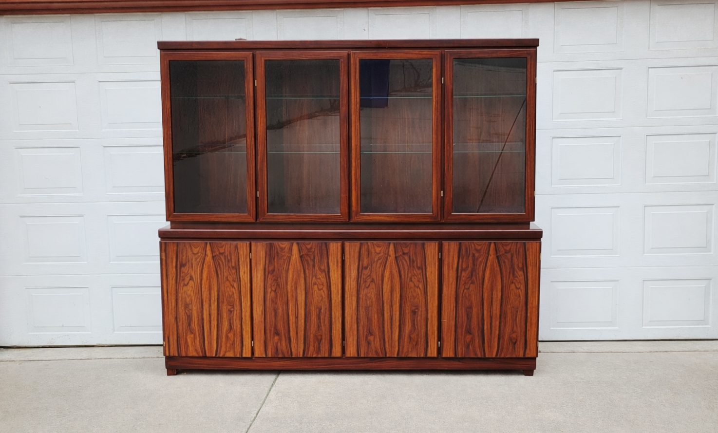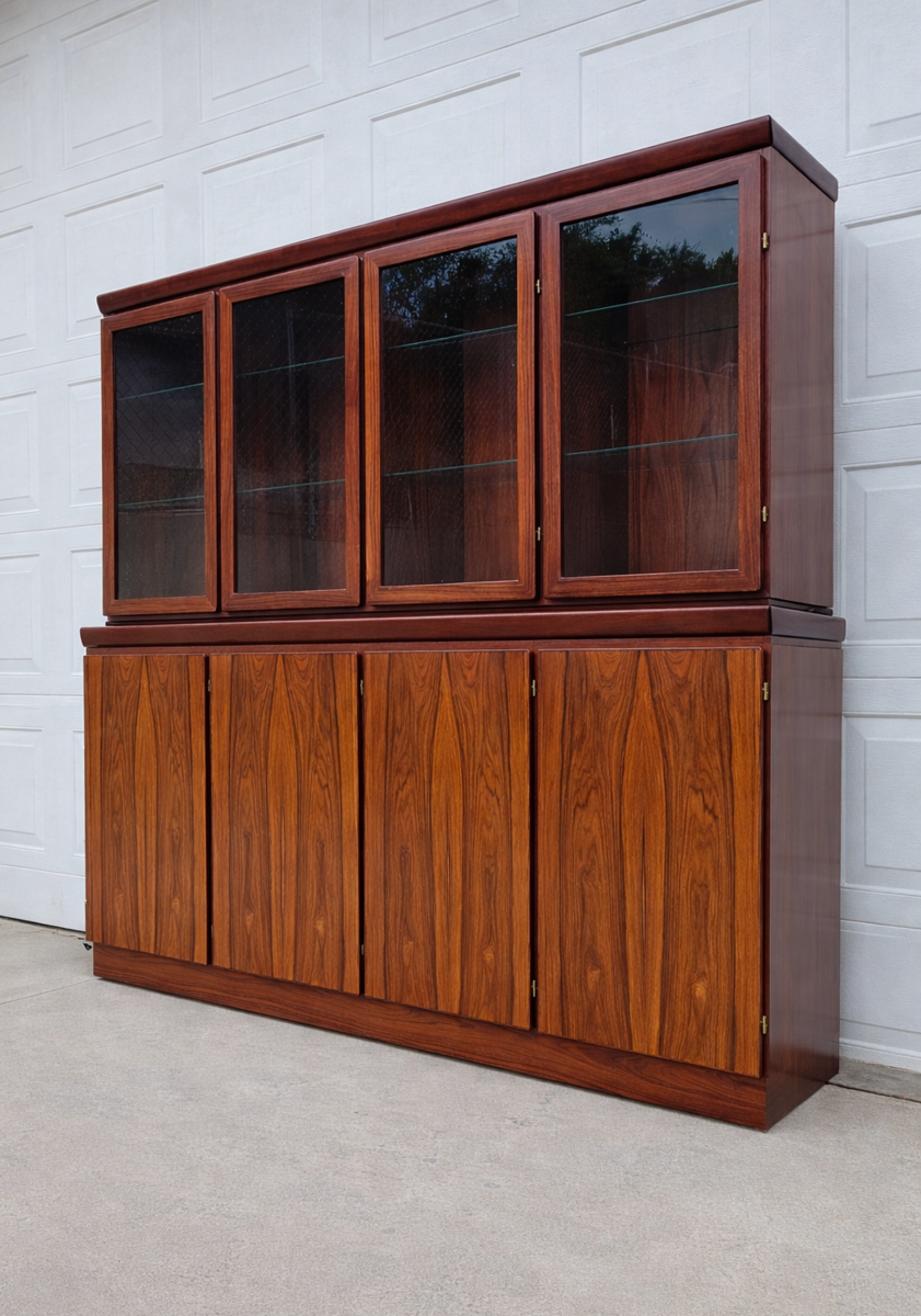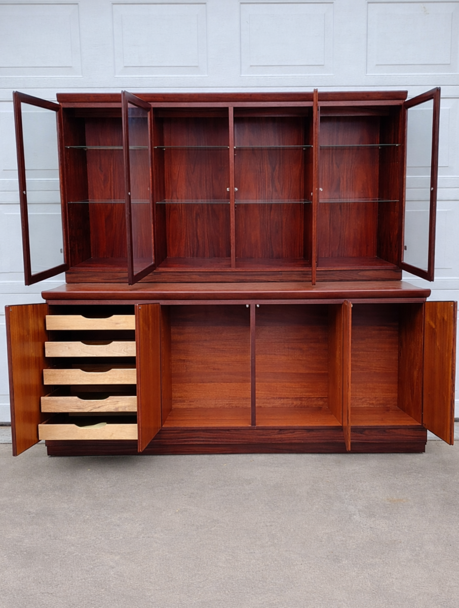 This is an absolutely gorgeous rosewood buffet/credenza with hutch. No wear shown at all. To say it is in excellent condition is an understatement. Even the doors have no fingernail marks from use. The upper section has glass shelves that have the dish display groove on the rear. Adjustable and/or removeable. It has lighting the full length on the top. The doors open, shut and latch as they should. Glass is perfect. The lower section has 5 drawers on the left side. They all glide well and are dovetail construction. The other is currently open for storage of taller objects. There is one long shelf for the middle and 3 smaller shelves for the right side. (not pictured.) All shelves are adjustable. These 2 pieces are extremely heavy and sturdy. Showroom condition. These must be seen in person to appreciate. Wonderful addition to any mid century collection.