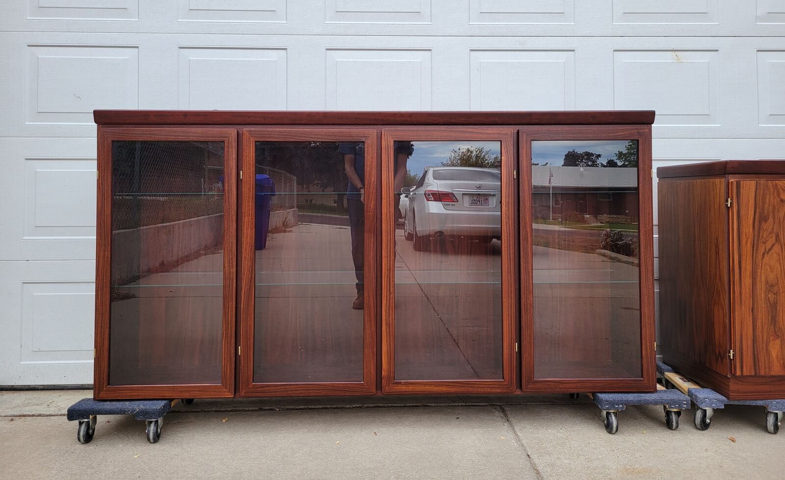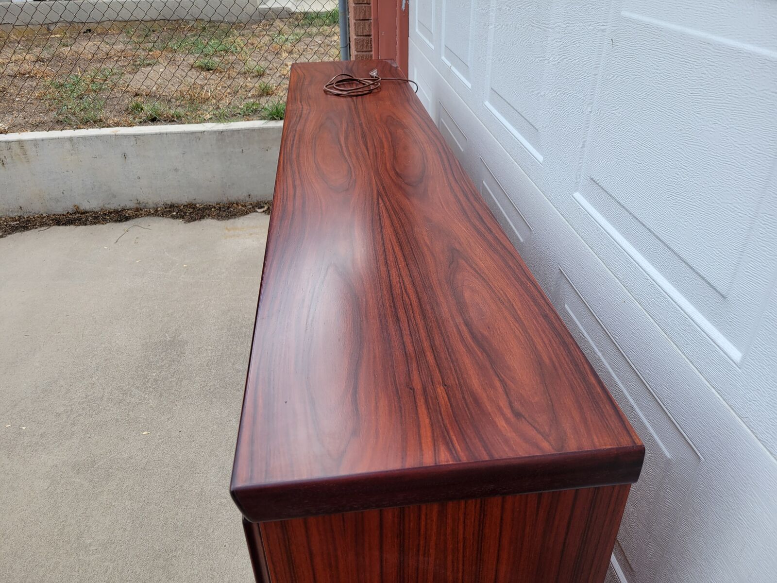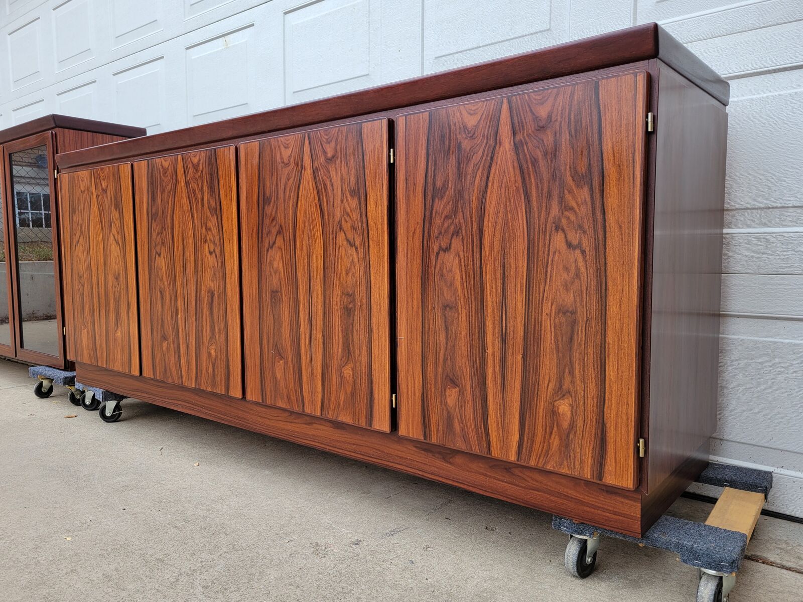 This is an absolutely gorgeous rosewood buffet/credenza with hutch. No wear shown at all. To say it is in excellent condition is an understatement. Even the doors have no fingernail marks from use. The upper section has glass shelves that have the dish display groove on the rear. Adjustable and/or removeable. It has lighting the full length on the top. The doors open, shut and latch as they should. Glass is perfect. The lower section has 5 drawers on the left side. They all glide well and are dovetail construction. The other is currently open for storage of taller objects. There is one long shelf for the middle and 3 smaller shelves for the right side. (not pictured.) All shelves are adjustable. These 2 pieces are extremely heavy and sturdy. Showroom condition. These must be seen in person to appreciate. Wonderful addition to any mid century collection.