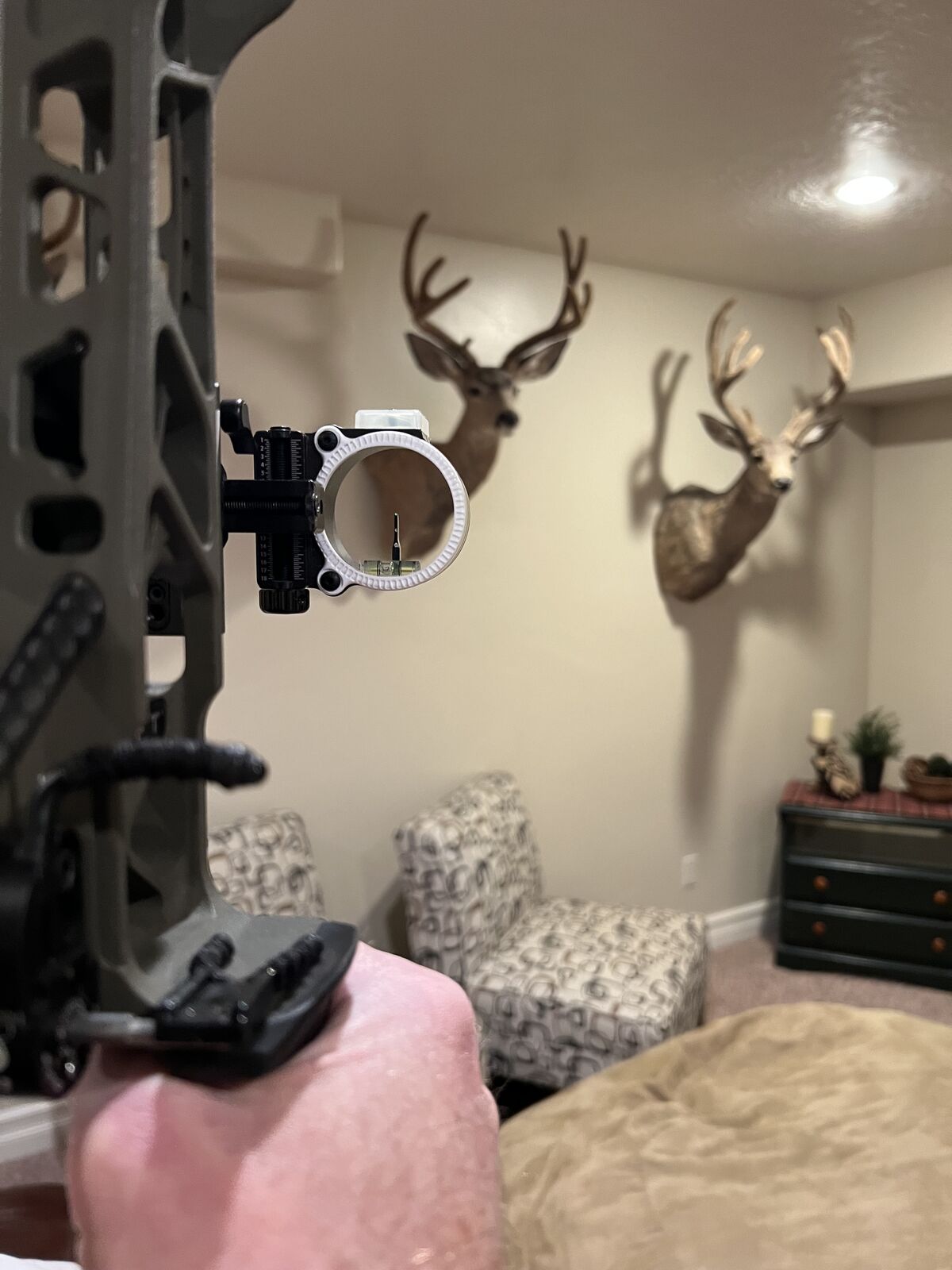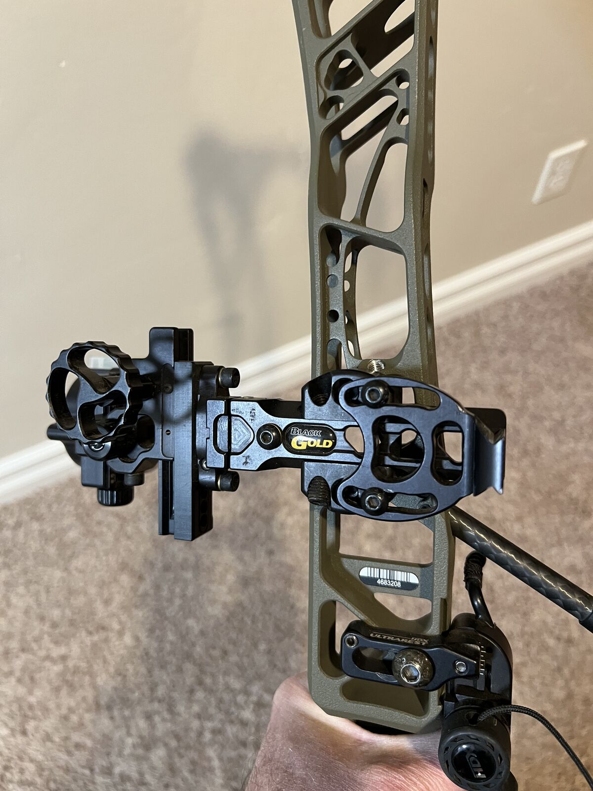 black gold single pin vertical slider mounted with additional 3 pin horizontal scope housing that can be exchanged to your preferred configuration.
