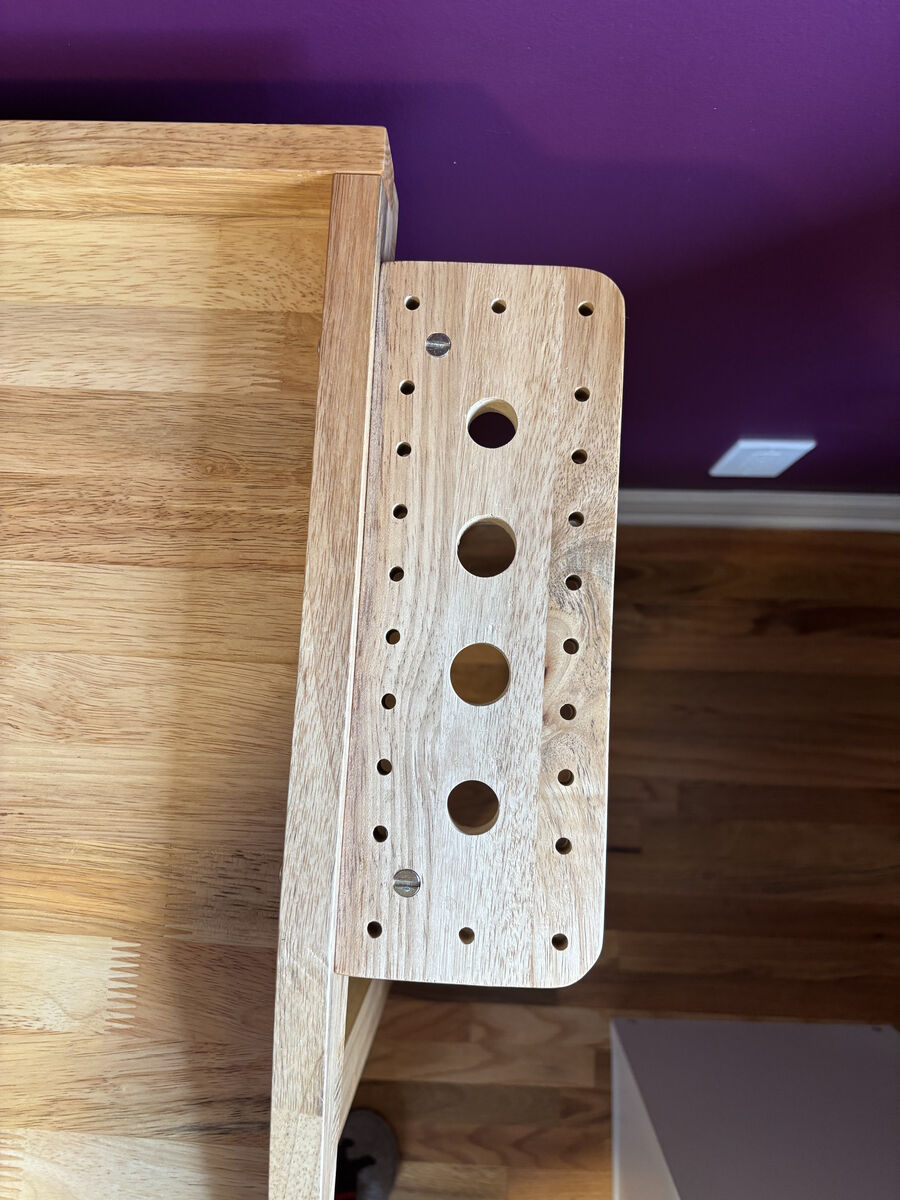 Solid hardwood cut-back benchtop Sliding tool tray Metal-lined catch tray for filings 3 drawers for tools and supplies Left & right slide-out arm rests Mandrel holes + bench pin Heavy, sturdy construction