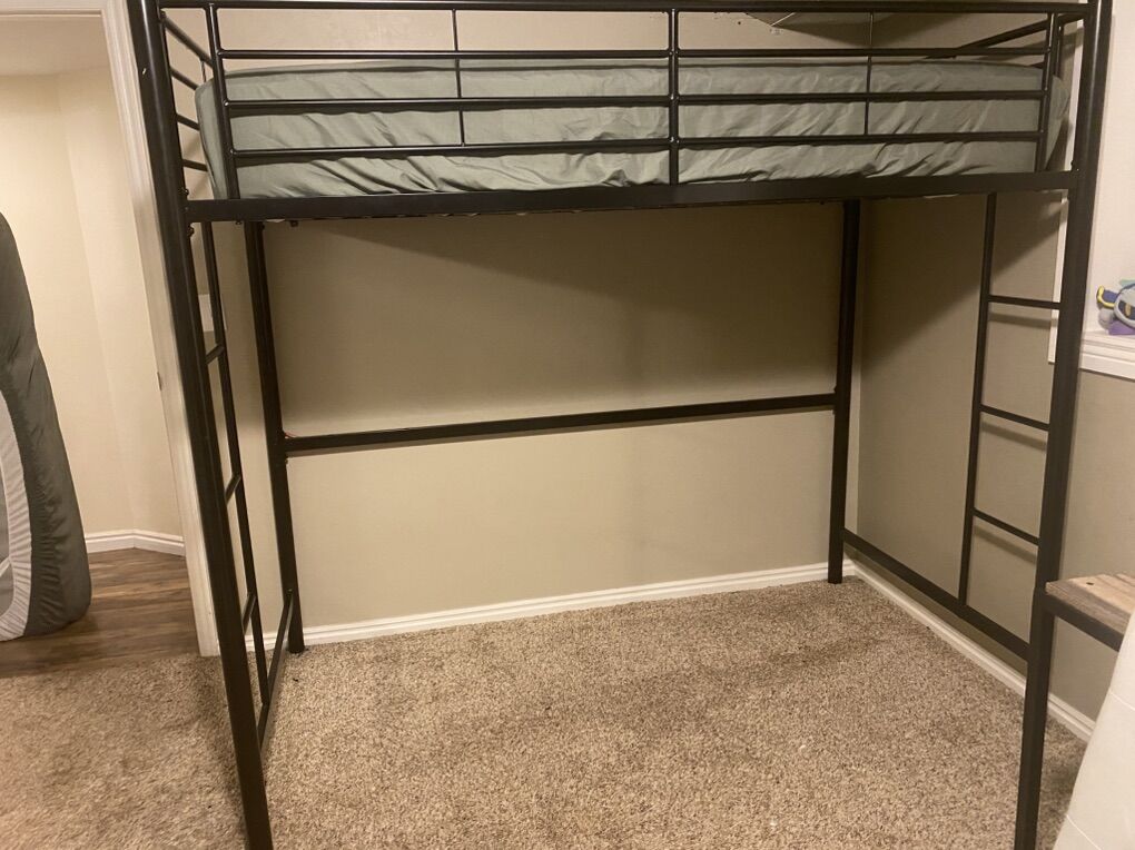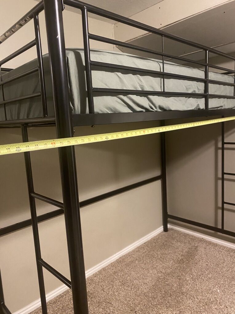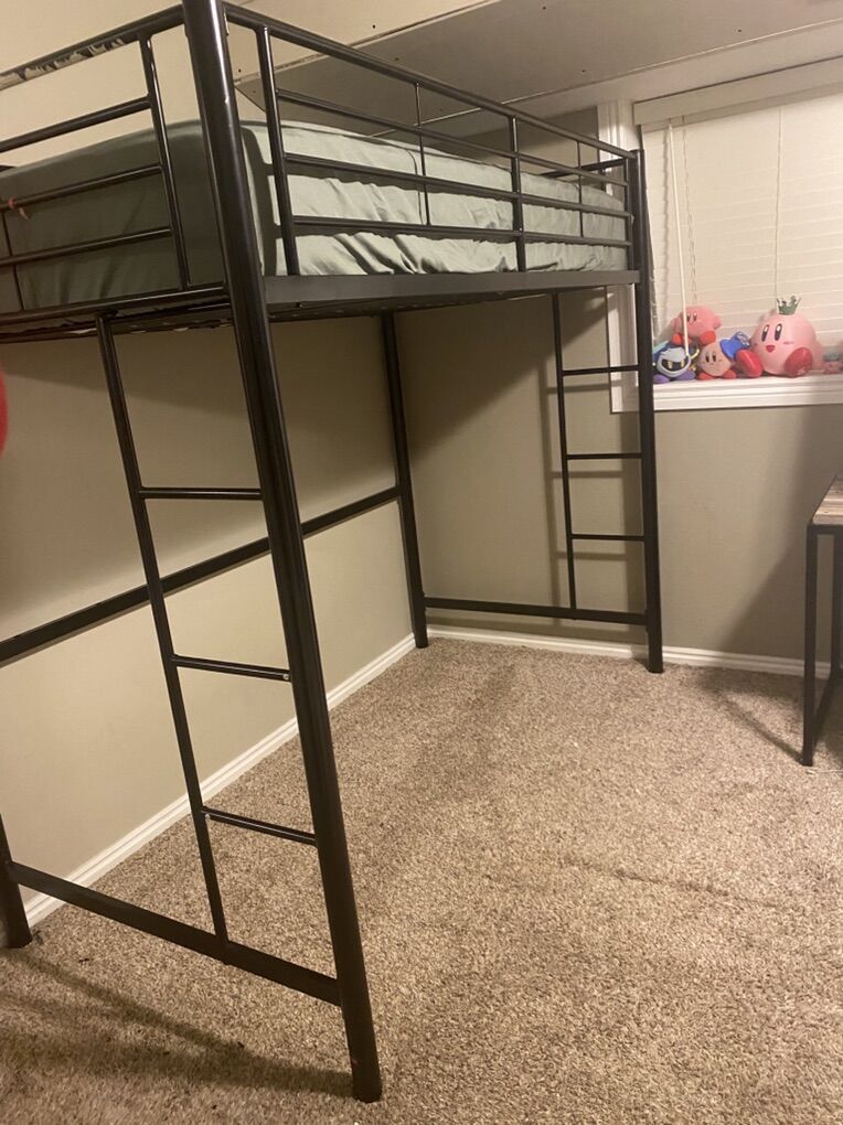 Like new and very solid black loft twin size bed. Clean non-smoking home. 70” tall with 55” clearance underneath. 42” wide 78” long. Comes with a clean like-new mattress. $100 or best offer