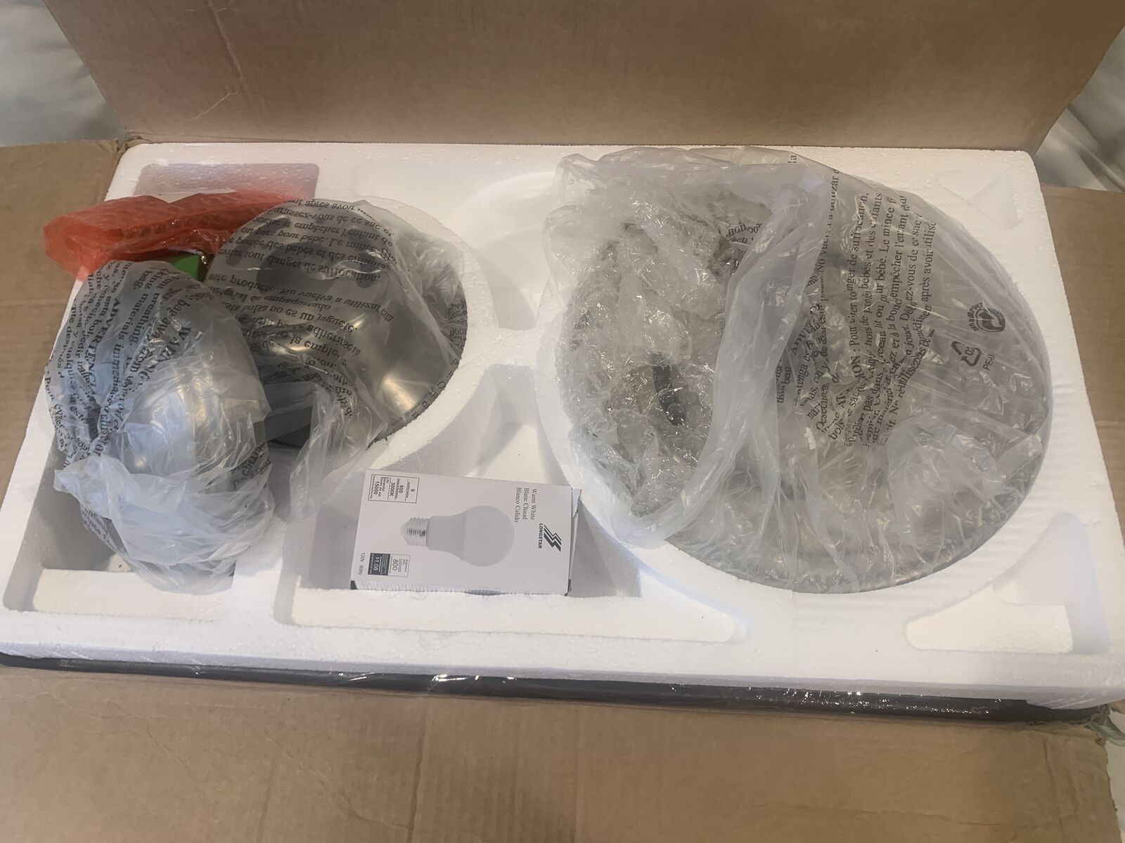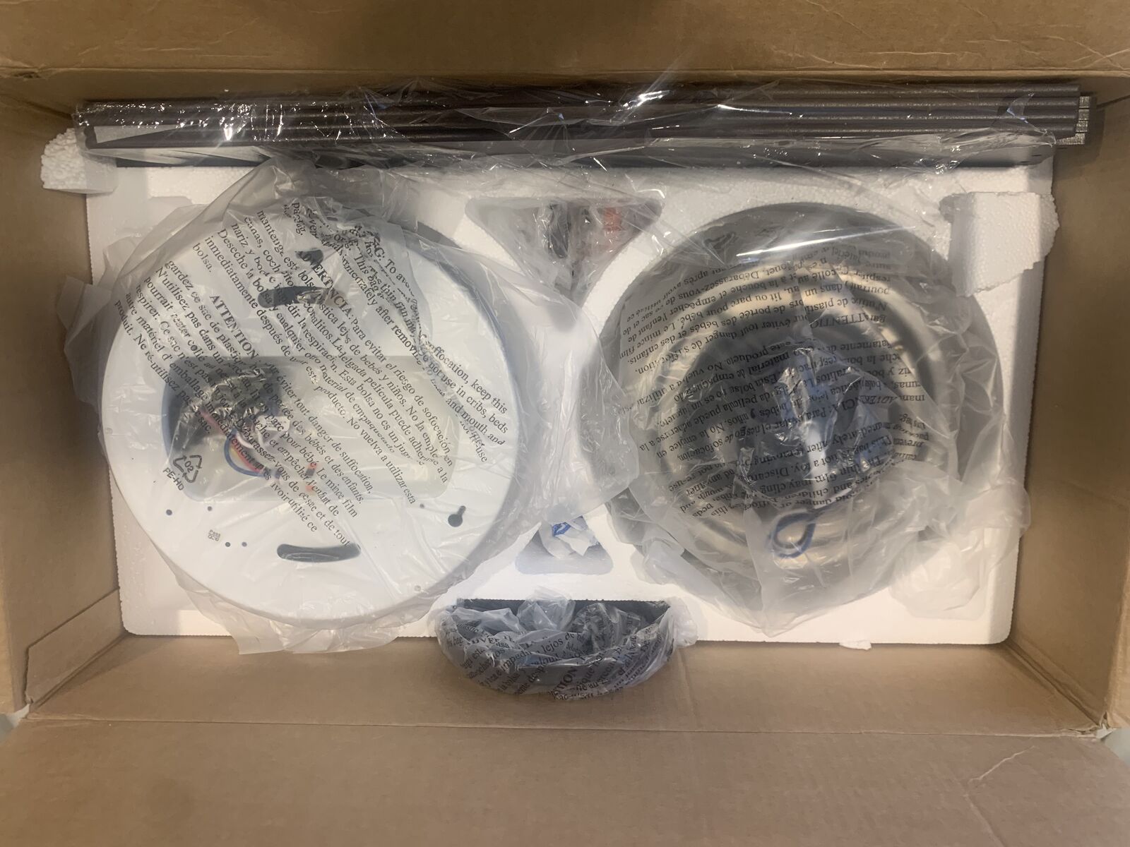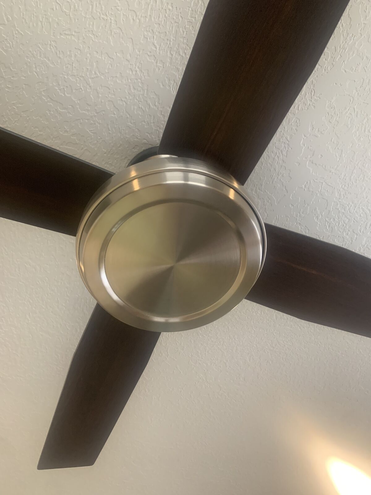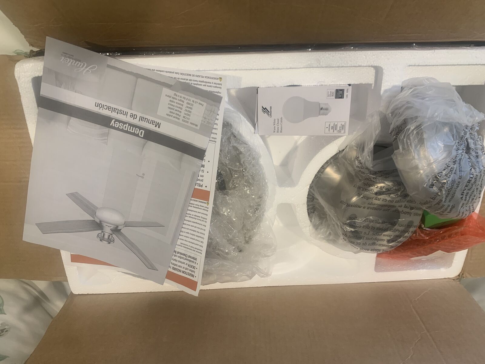 VenmoBrand new Hunter Dempsey 52-in Brushed Nickel ceiling fan with Black Oak/Chocolate Oak Blades, Flush Mount Ceiling Fan Without Light, with Remote Control, Model 59241. New in box - this box originally had a LIGHT, but that was removed and used. So it can be set up as shown in the pics (those pics are of another fan - not what you see wrapped up in the box).