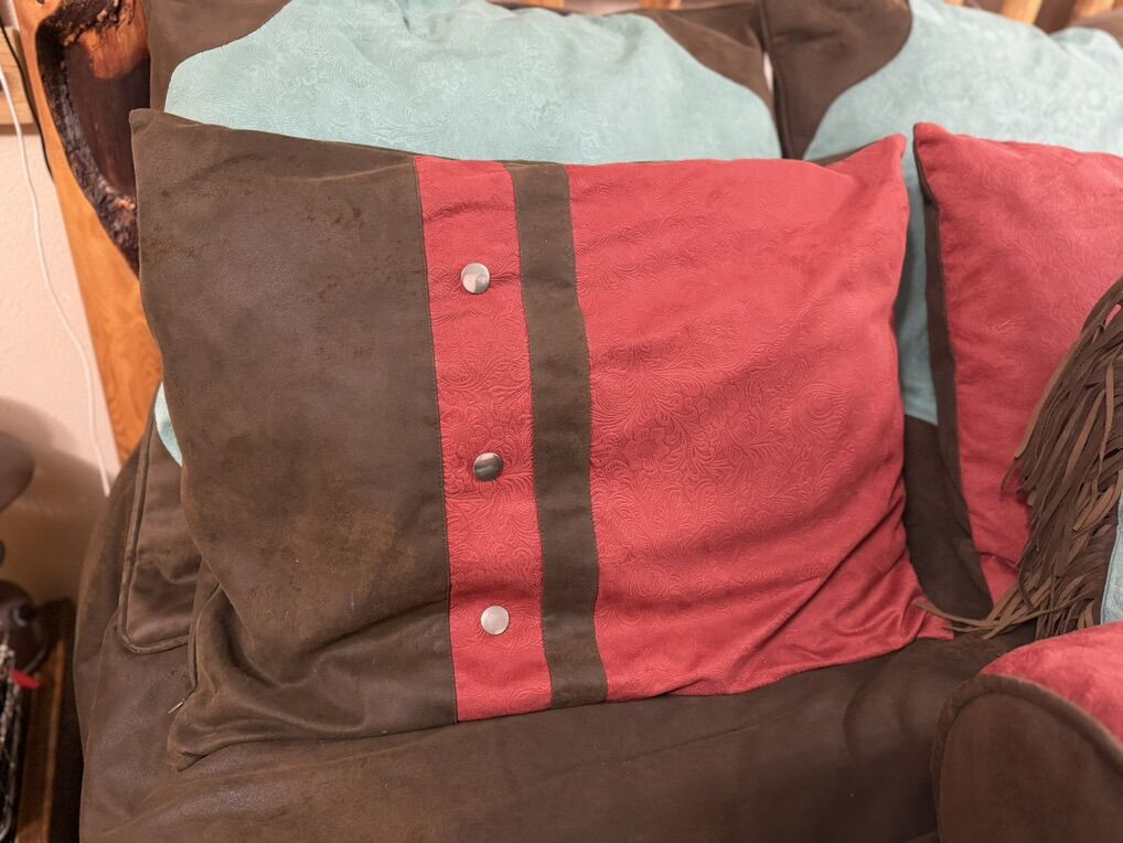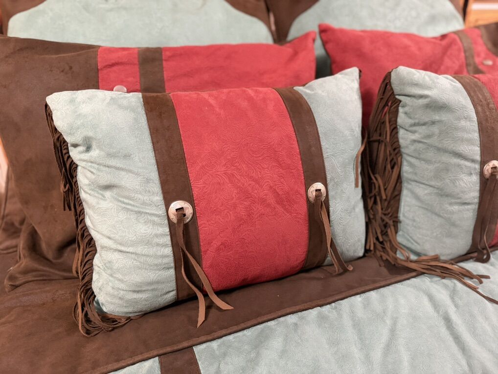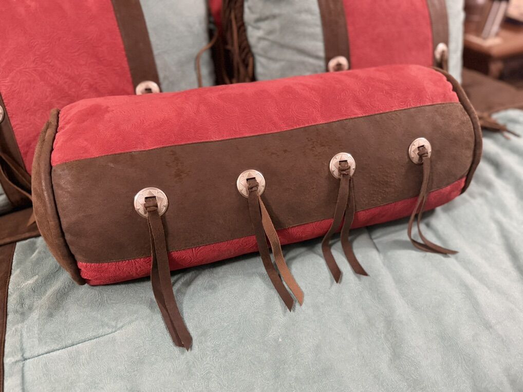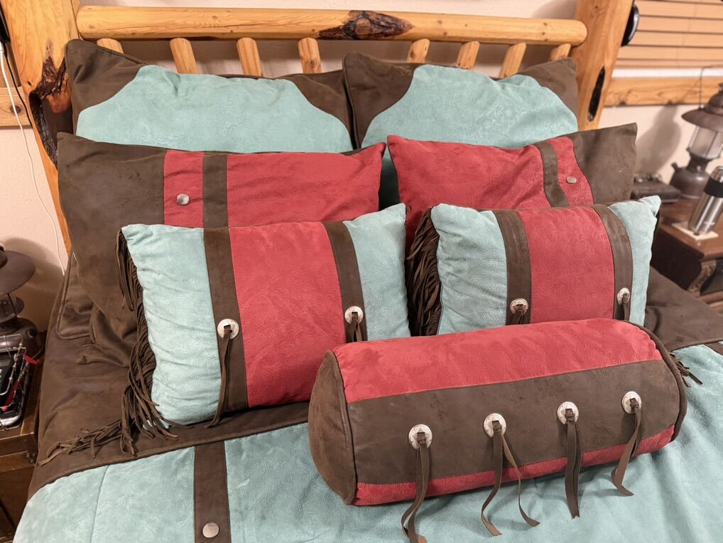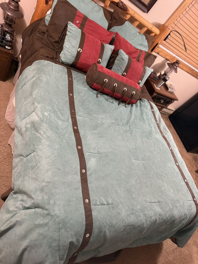 This Western themed Turquoise Cheyenne bedding has a bold and vibrant look of using faux textured suede fabrics of turquoise with brown faux leather trim and silver-toned star conchos for a western accent. Dry clean is recommended. This queen Comforter 5 piece Set includes a 68x88 comforter, two 20x27+3 pillow sham, 39x76+16 bedskirt/dust ruffle, 2-16x24 cushion, and 8x21 neckroll. Dark brown bedskirt with split corners to accommodate footboards and bed posts.