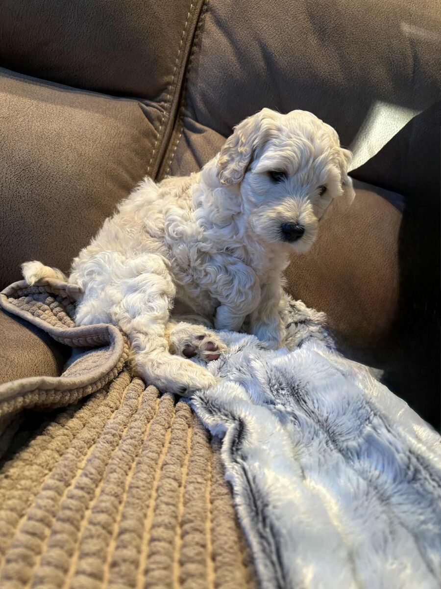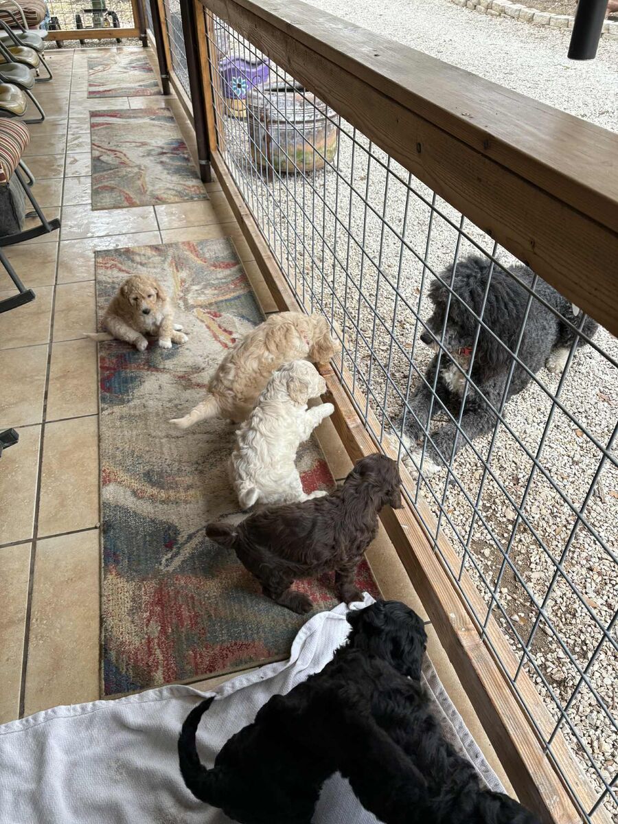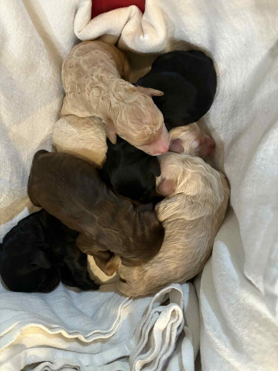 These cuties were born on Chritsmas Day go home is ST Valentine's Day!! They are a Holy Bunch! Mama is 42 lbs SheepaDoodle. Dad is 38 lbs Goldendoole. Text Shaunna Two zero eight-697-one zero zero two. Vaccniated and loved=)) https://BernePoodleDoos.com/