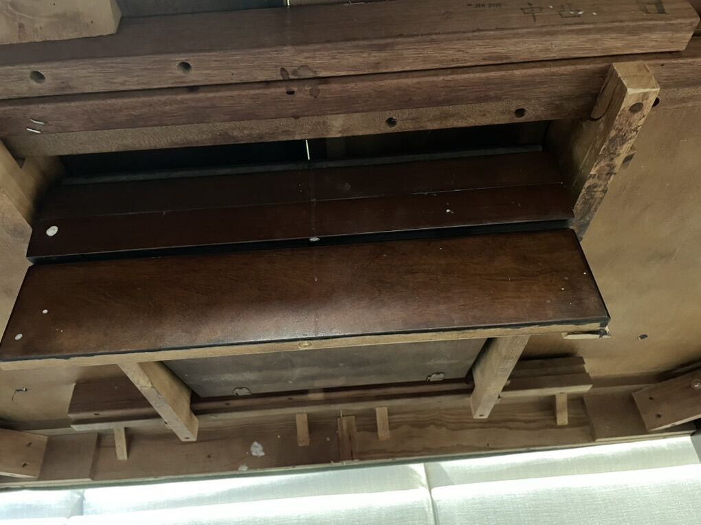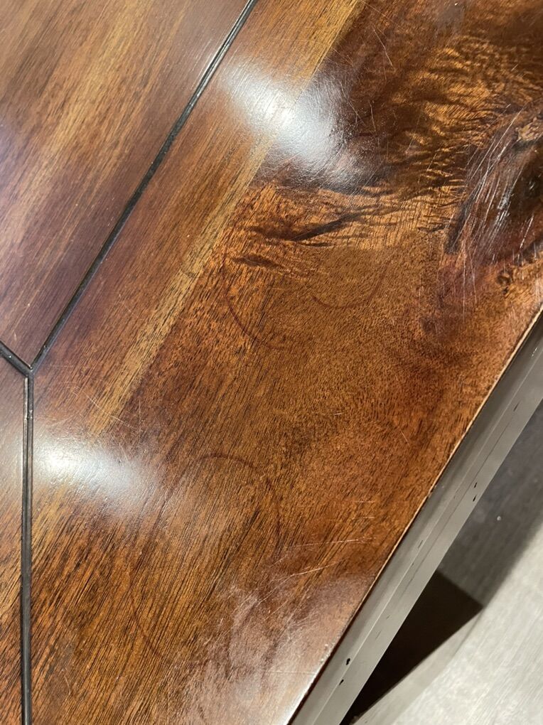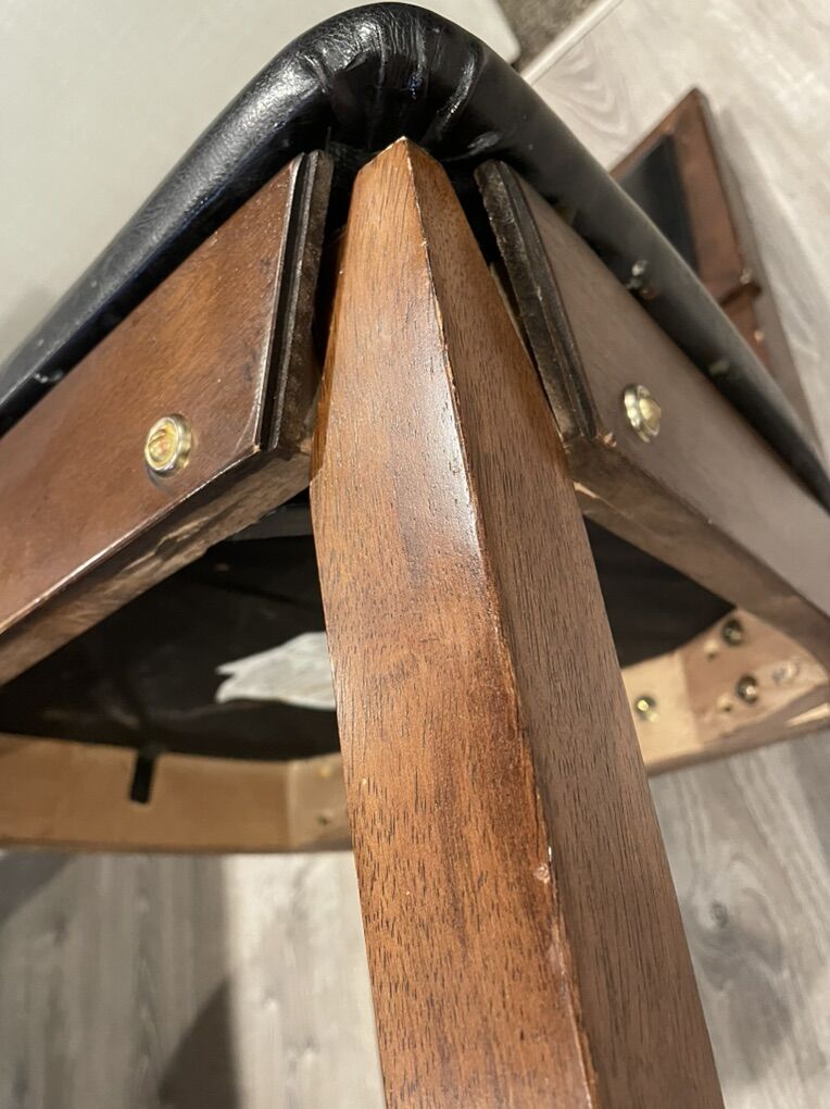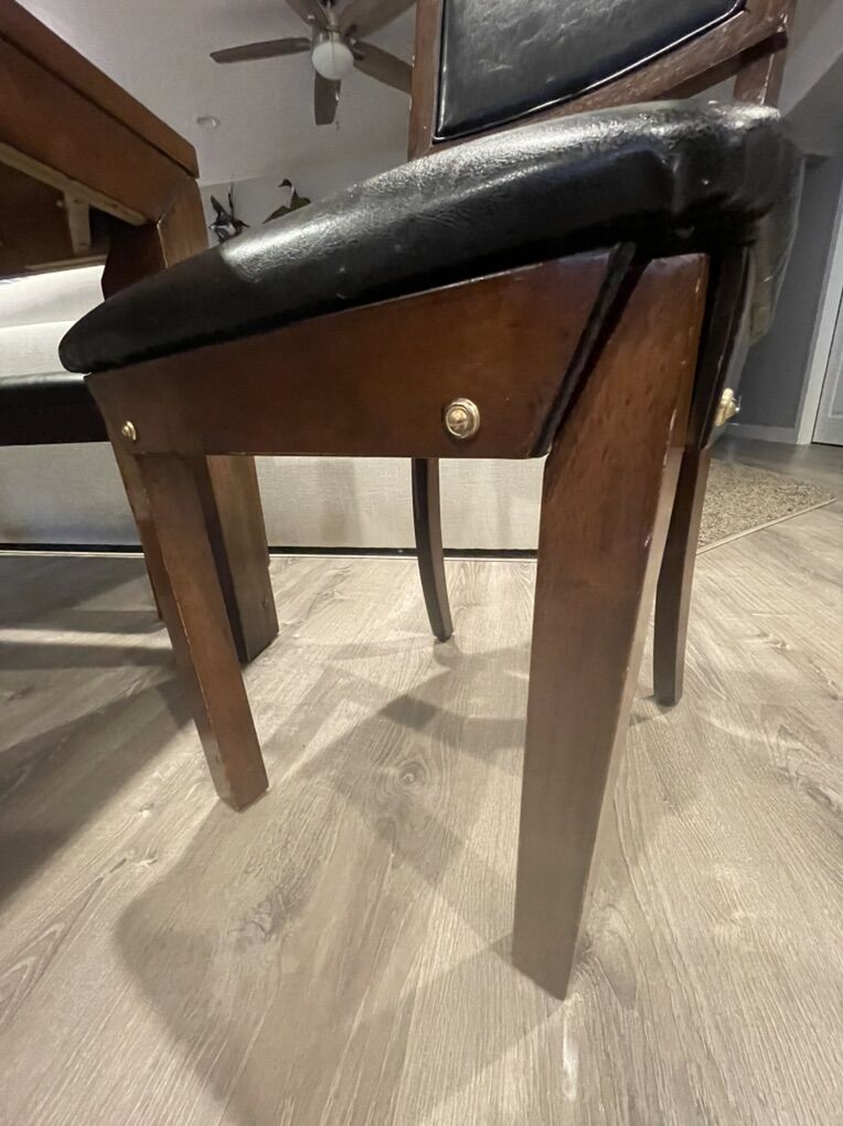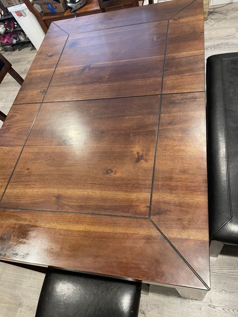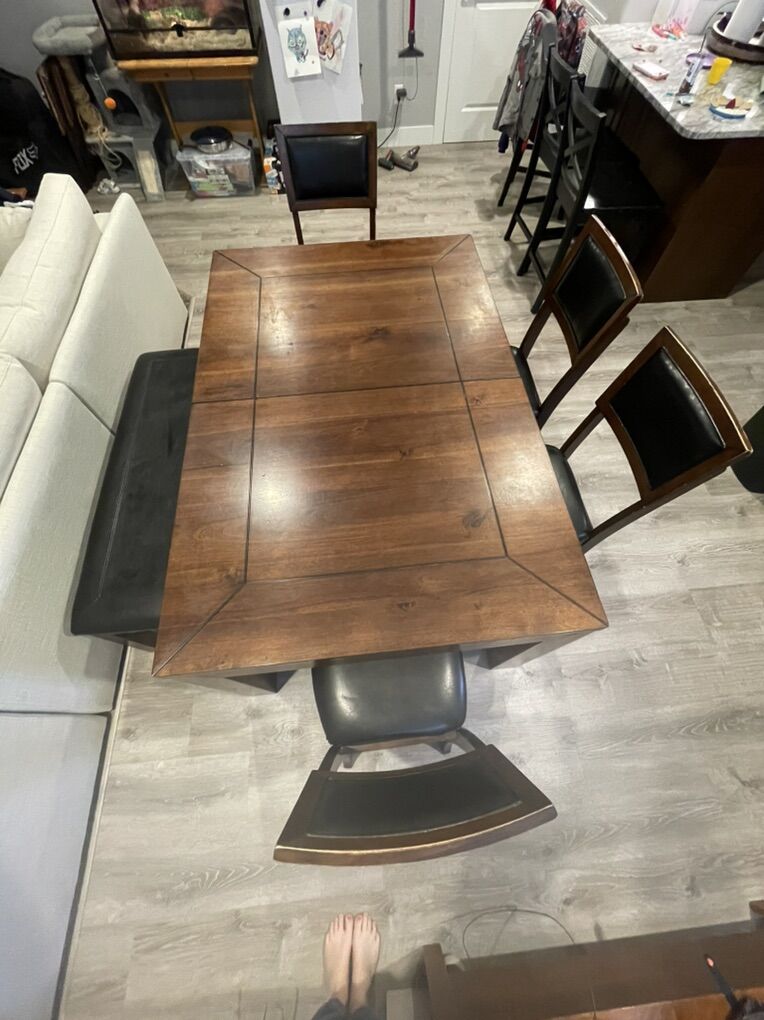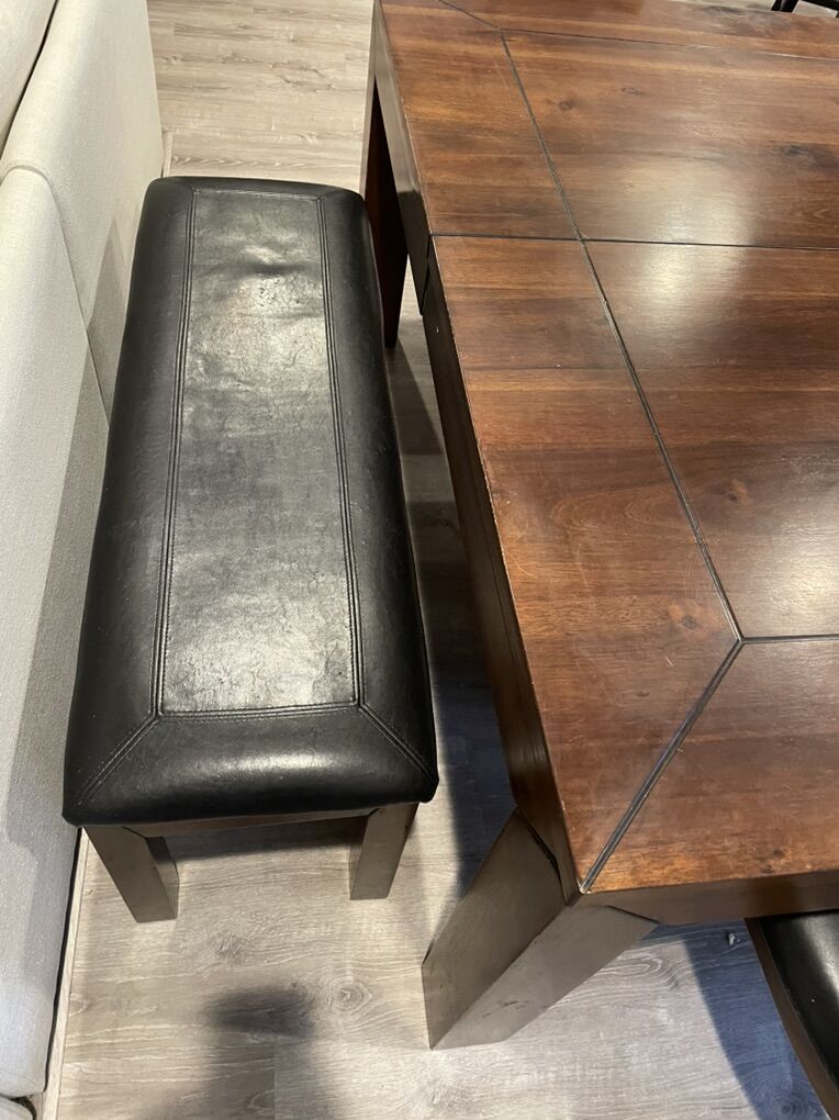 VenmoSolid wood, in decent shape, 1 chair has a wobbly leg could probably be fixed but is still usable, another chair the previous owners fixed a leg but it still works(shown in picture). Faded smiley face where my toddler drew (shown in picture). The bench does slide under the table if you want. There is a leaf underneath, I’ve never used it I have no idea how.