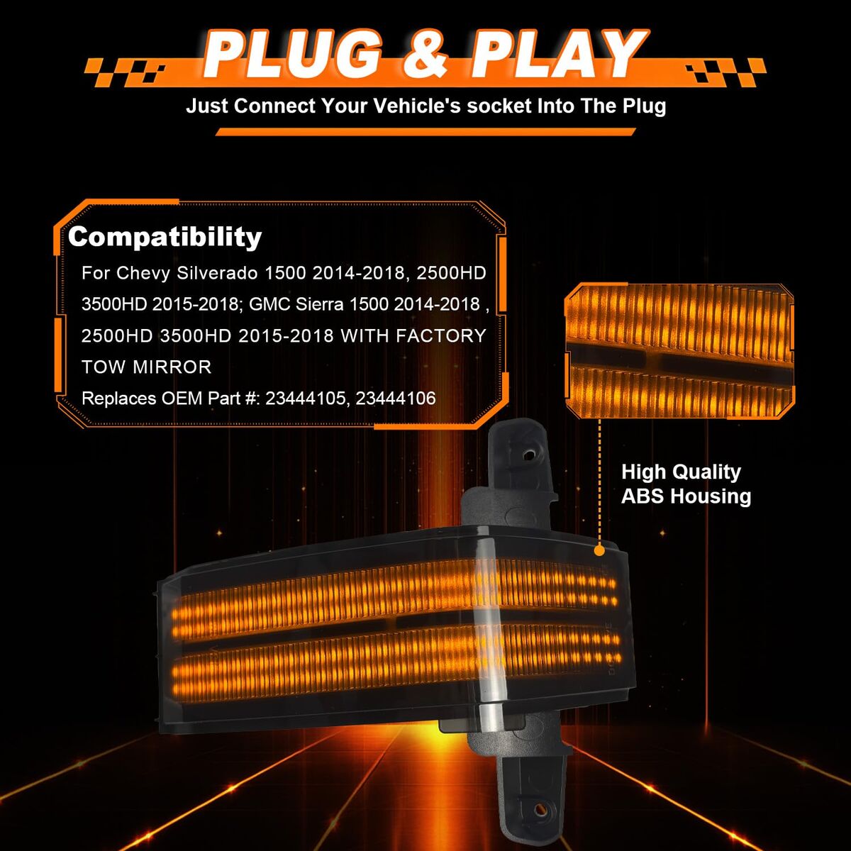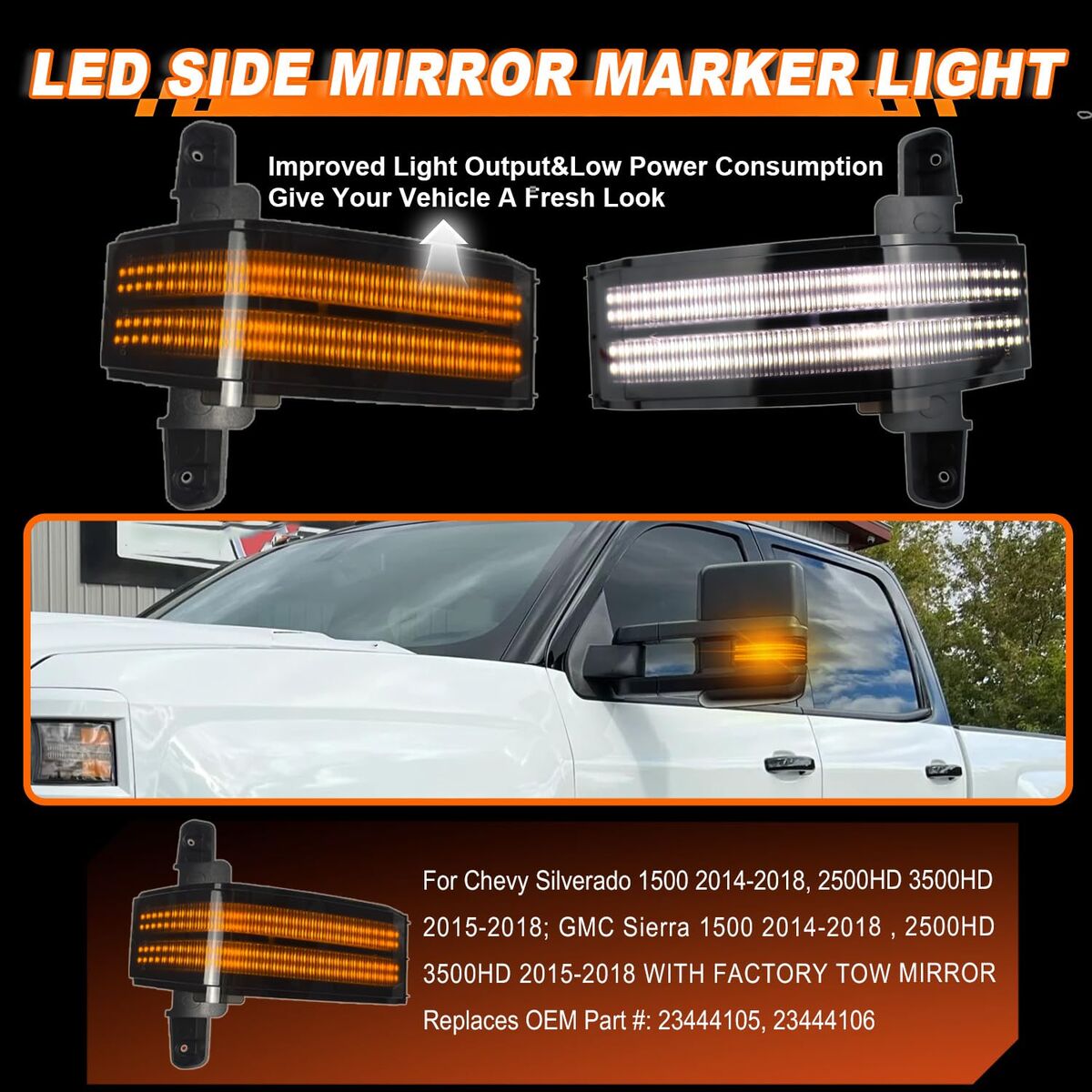 Perfect Fit for Chevrolet Silverado 1500 (2014-2018)Direct replacement LED side marker Mirror lights designed SPECIFICALLY for Chevy Silverado 1500 2014-2018 , Chevy Silverado 2500HD 3500HD 2015-2018 , GMC Sierra 1500 2014-2018 , GMC Sierra 2500HD 3500HD 2015-2018 WITH FACTORY TOW MIRROR Replaces OE Part #23444105, 23444106.Guaranteed fitment. Super Bright Amber&White LED & Stylish UpgradeFeatures high-power LED chips delivering ultra-bright amber&white light – 5X BRIGHTER than stock bulbs! Significantly enhances side visibility and safety at night or in low light. The Light adds on the white Daytime Running light and Amber Turn Signal light all in one IP67 Waterproof & All-Weather DurableBuilt to withstand the elements! Rated IP67 waterproof to resist rain, snow, car washes, and dust ingress. Constructed with U-V-resistant materials to prevent fading and cracking for long-lasting performance in any weather. True Plug & Play InstallationPLUG AND PLAY** No cutting, splicing, or complex wiring needed. **Preserves your factory housing.** Simply remove the old marker light and plug this one in. A hassle-free, perfect OE upgrade. Complete KitMeets strict DOT & SAE safety and performance standards for road legality and reliability. Includes 2 premium smoked lens Side marker lights with bright amber&white LEDs. Backed by responsive 24-hour customer support. 196035 2-1-26 00.1 rt50