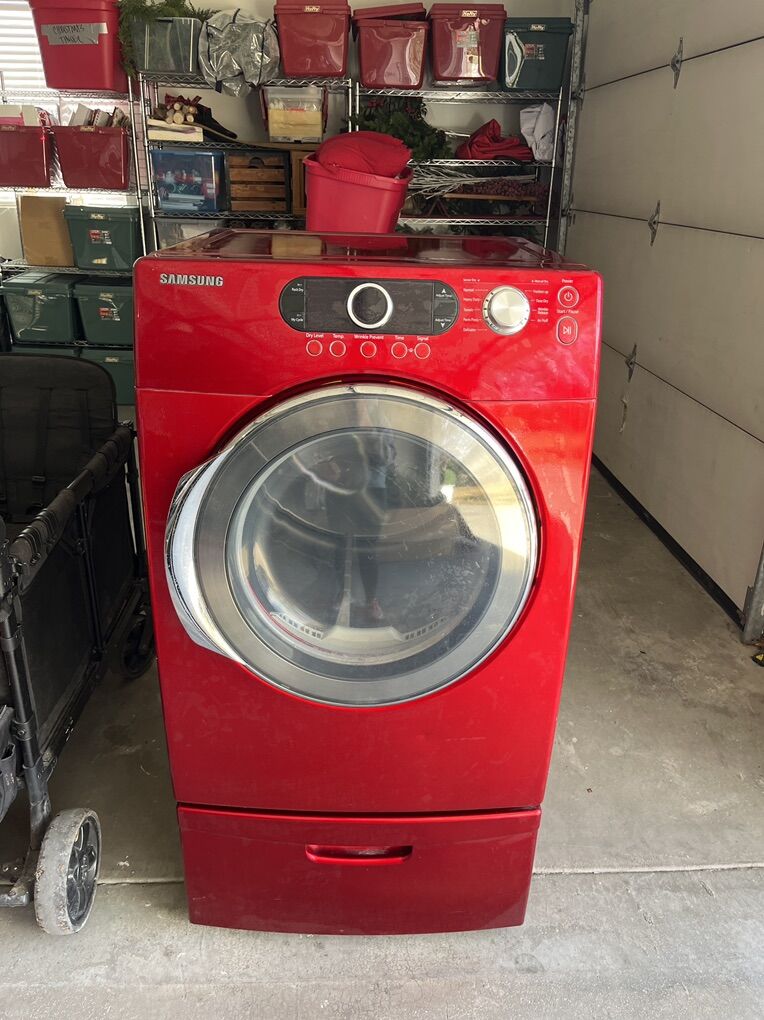 VenmoRed working front load GAS Dryer with bottom storage drawer. dimensions are: 27 wide 28 deep 52 high
