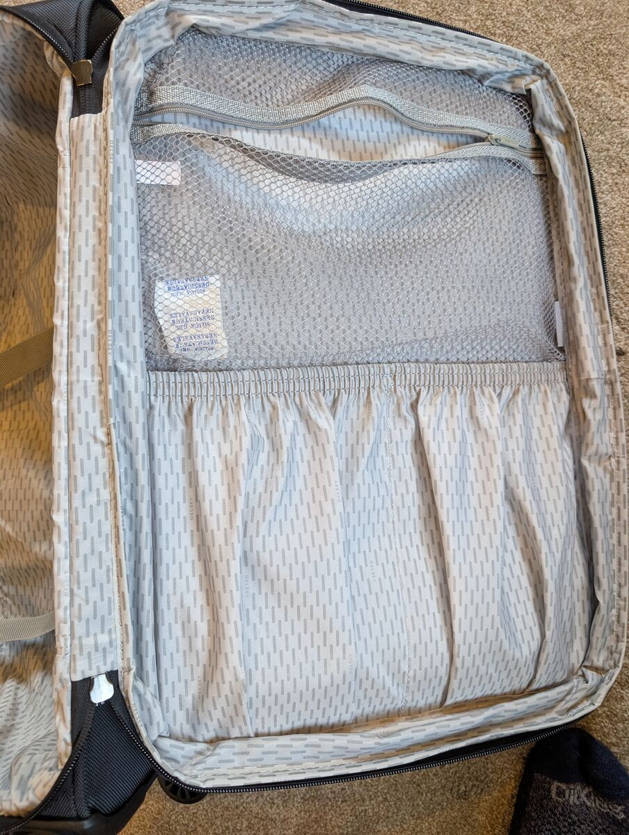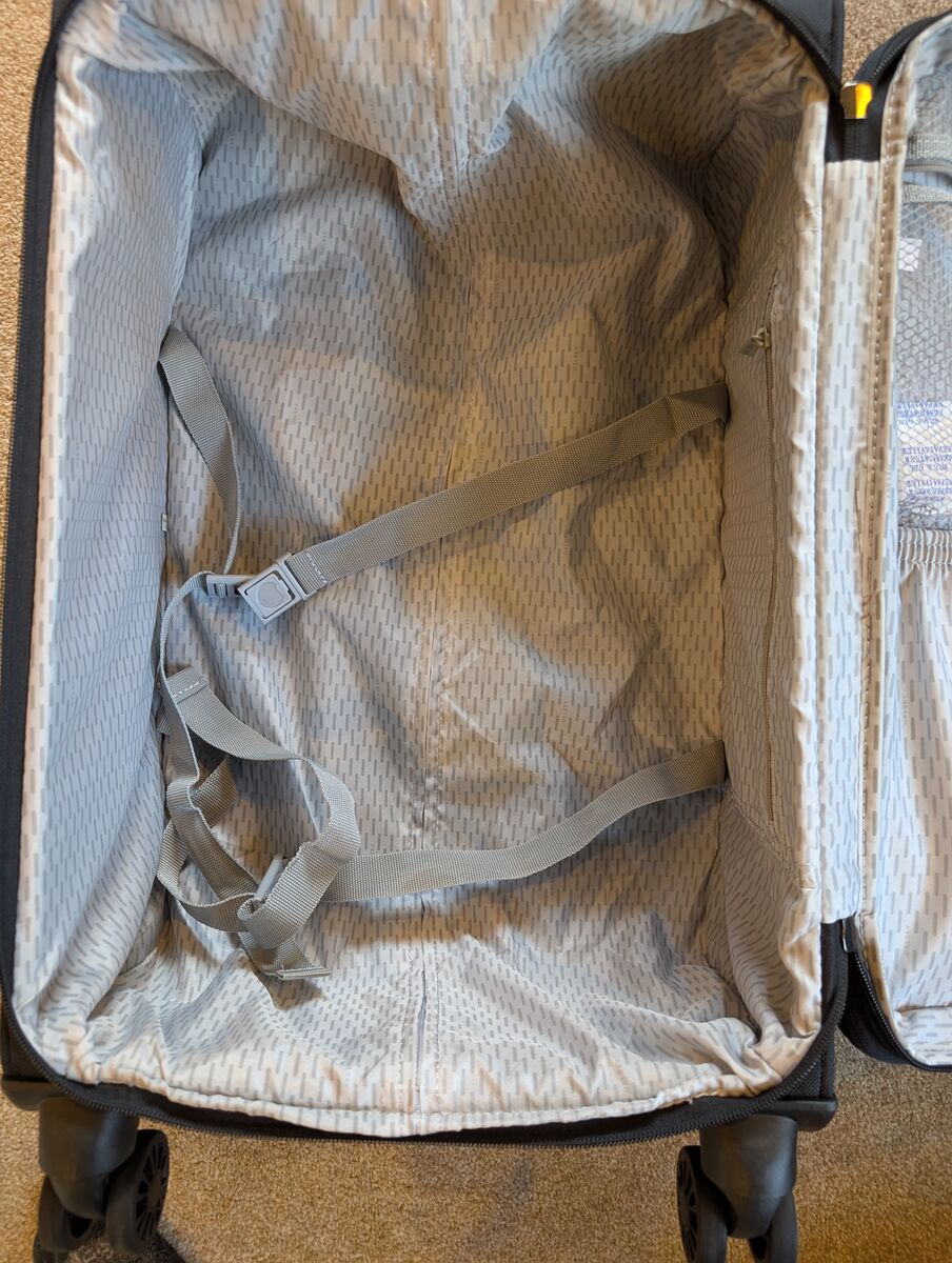 Spacious interior with zippered compartments and straps to keep clothes secure