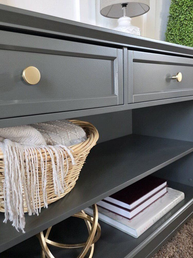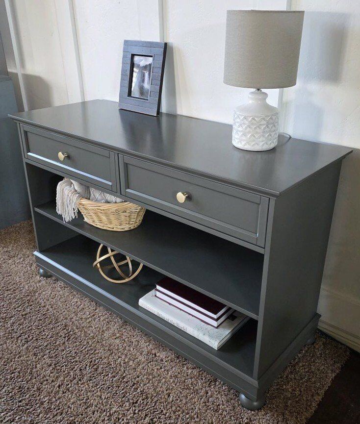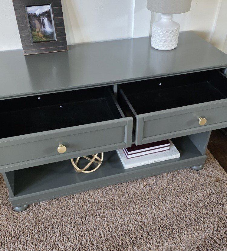 VenmoBeautiful custom-painted console table finished in Benjamin Moore Advance "Ashwood Moss" Features two smooth-glide drawers with modern hardware and two open shelves—perfect for an entryway, living room/sofa table, or TV console. Dimensions: 48” wide × 30” tall × 18” deep