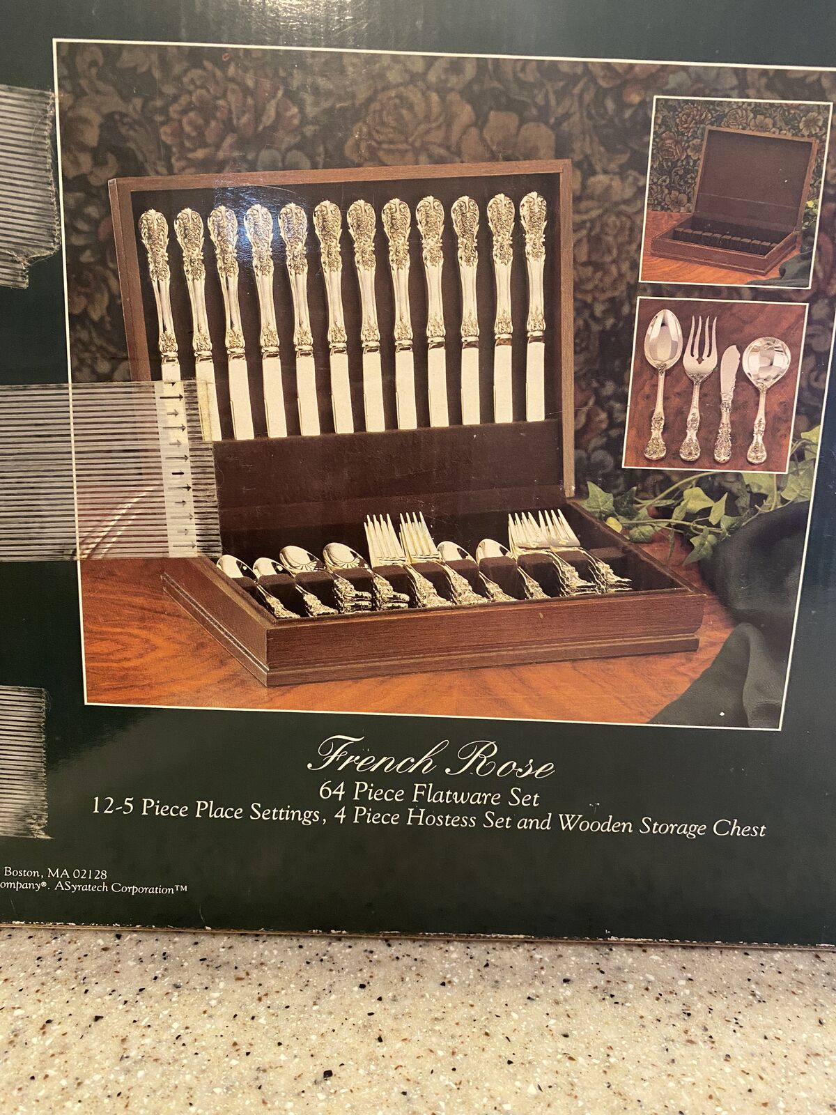 CashAppFB Rogers and sons Silver Plated silverware set. 12 serving piece, French Rose design, never used, perfect condition. Wooden case. Cardboard box shows some wear.