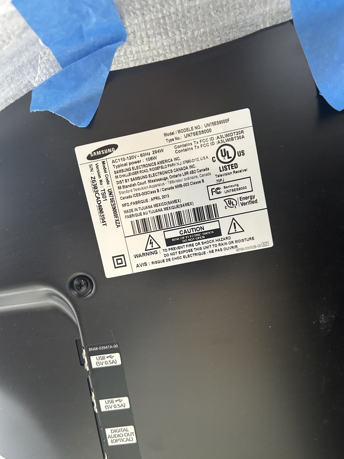 ZelleSamsung 75 inch flat-screen TV (2013 UN75ES9000) with wall mount.