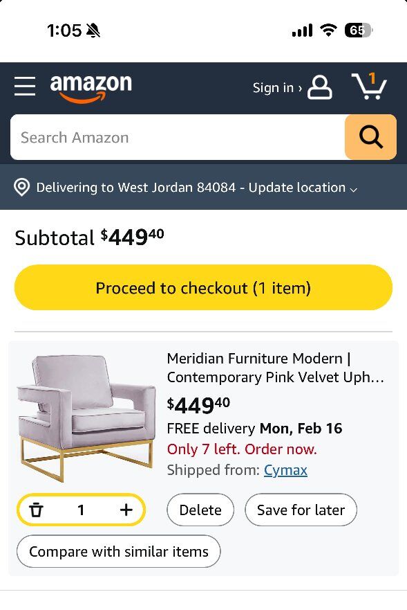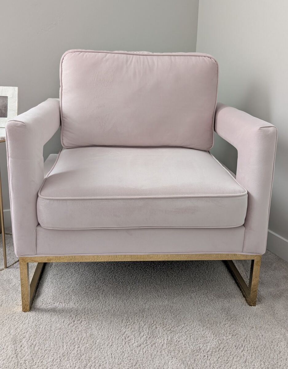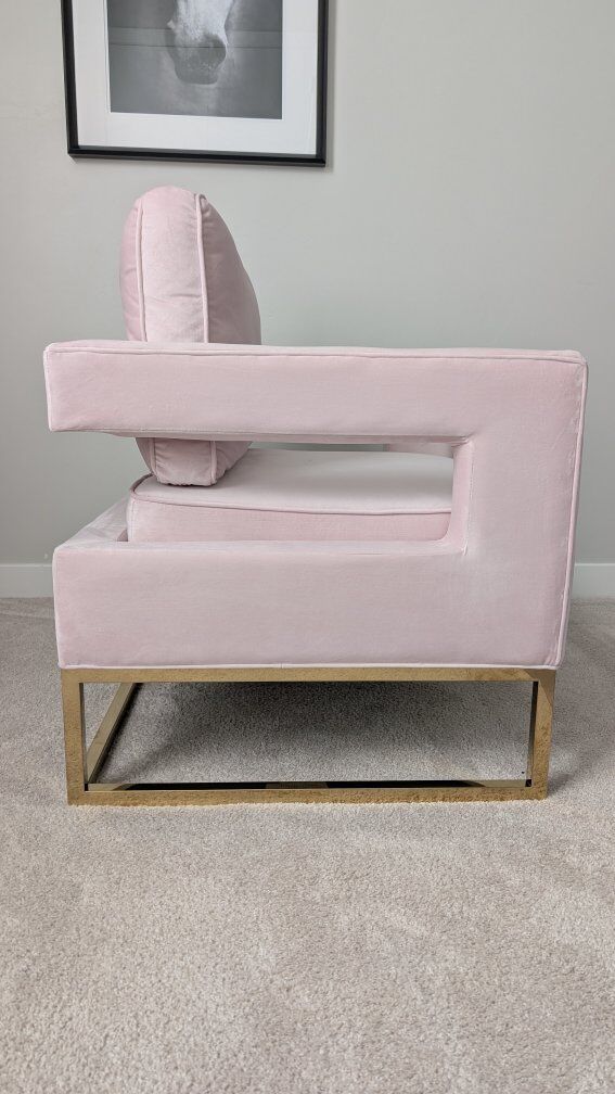 ZelleThis chair is in excellent shape. Sat in a home office with little use. The material is velvet with gold legs. Goes for $450 brand new on Amazon. Shoot my a text or DM!