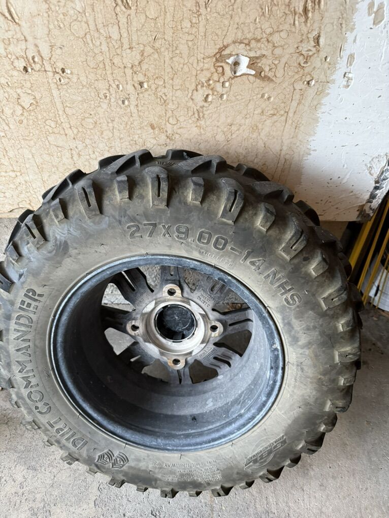 Venmo4 tires and wheels and lug nuts decent wear. They are worn but will make great spares 27 x 11 27 x 9