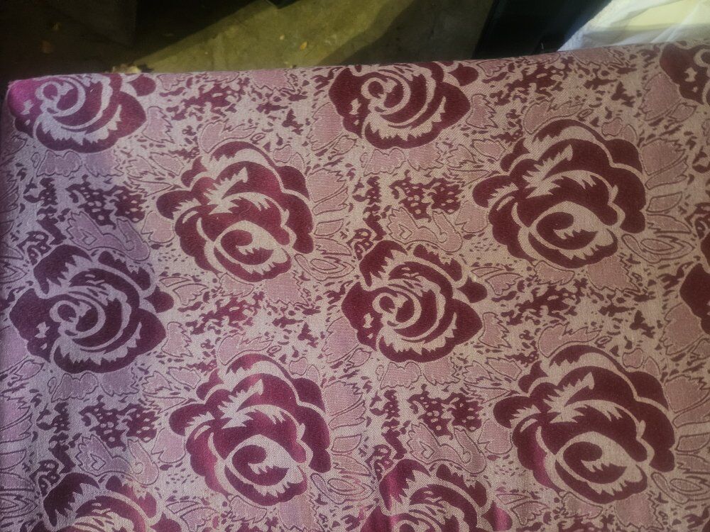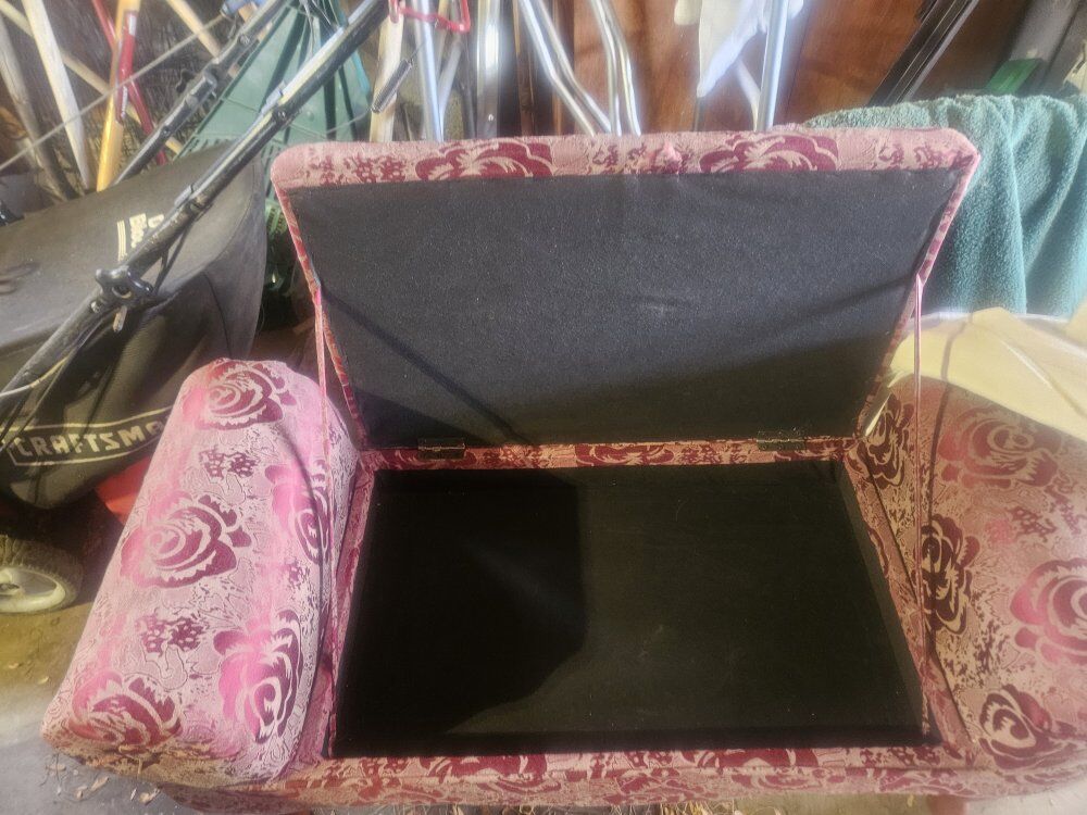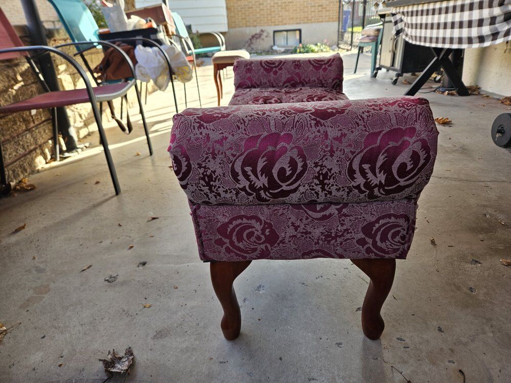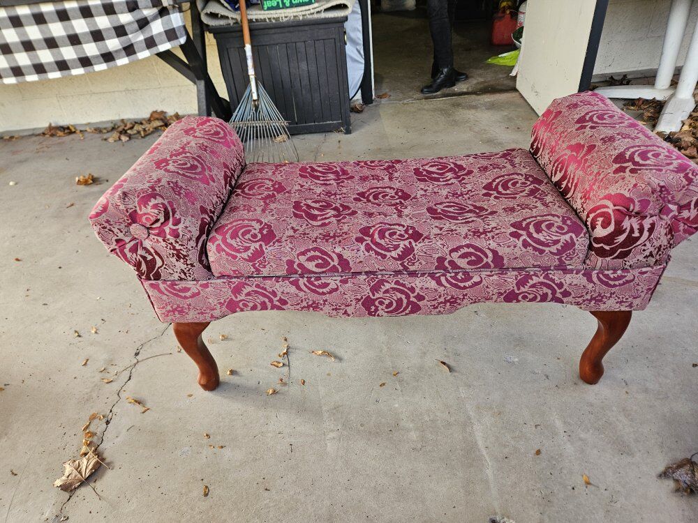 VenmoClassic ottoman in jacquard rose upholstery and cherry-stained Queen Anne-style wooden legs. Hinged seat opens for storage. Capacity. 42" w x 22" h x 16.75" d.