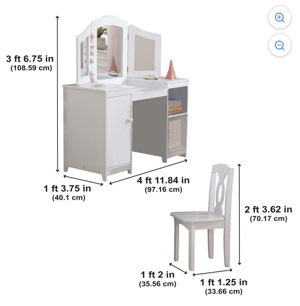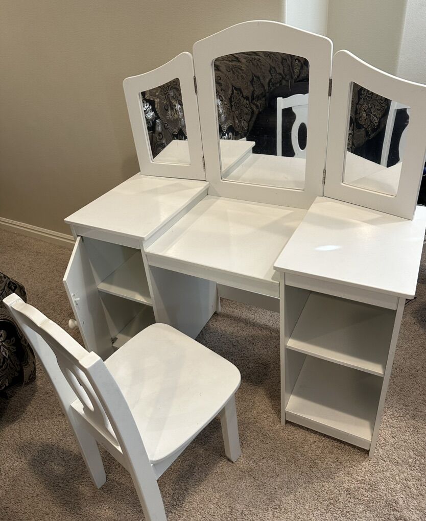 VenmoDesigned for imaginative play as well as keeping things organized, this is the perfect first vanity set for your child. Sturdy wooden construction with matching chair will work in almost any room you put it in. Large acrylic mirror with adjustable sides makes it easy to do hair or makeup. The shelves are great for storing whatever you need: makeup, brushes, clothes, toys or any other precious treasures your child might have. First two pictures stock photo of the items, the rest are the photos are what you would be purchasing. Dimensions are: *Vanity dimensions: 41(L) × 16(W) × 46(H) *Chair dimensions: 14(L) × 14(W) × 28(H) *Seat height: 14 *Weight: 48 lbs