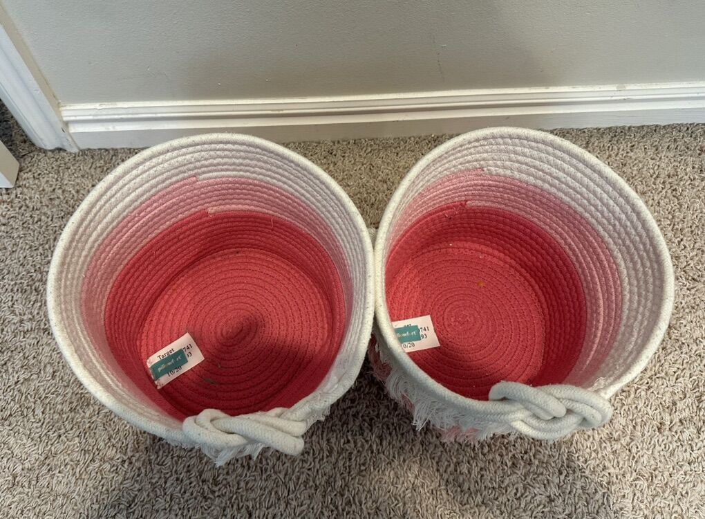 VenmoPrice listed is for both and being sold as a set only. These are adorable fabric baskets originally purchased from Target. We used them in the vanity (sold in a separate listing) but they would be cute in any little girls room and could be used for toys, hair things, crafts, etc. Dimensions are: 9-9.5 inches wide x 7 inches tall. Yes they have been used. Yes they are in great condition, may show minimal signs of wear.