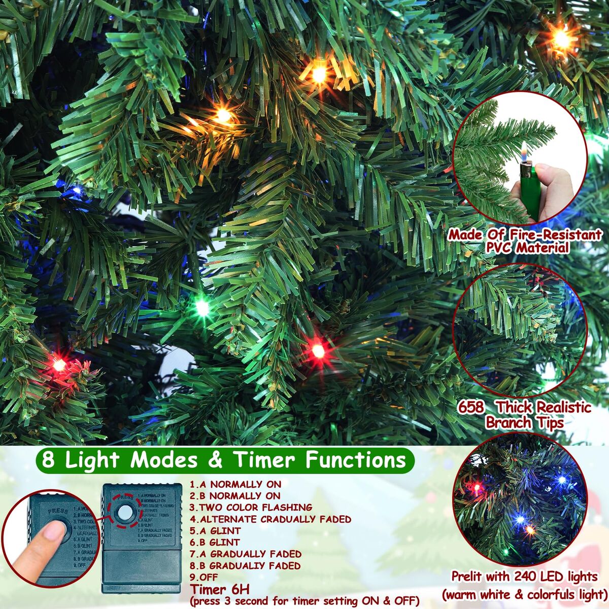 Prelit Artificial Christmas Tree: 6Ft Pencil Christmas tree comes with 240 LED( Fours Colors Changing: warm white lights color lights). 658 Thick lifelike branch tips. 6Ft Christmas tree is eye-catching Christmas centerpiece; Size: 6 ft*1.8 ft Prelit 240 Warm White & Multi-Color Changing Lights & 8 Modes & Timer: Prelit christmas tree come with 240 prelit LED lights, Fours color options: warm white lights and multicolor lights; 8 lighting modes, 6H timer; Control switches for easy settings Hinged Branches & Metal Stand: Featuring hinged branches that is convenient to drop down and fold back; Made of classics branch and metal stand materials; Flame-retardant branches; Metal cross stand for stability; requires branch separation for full appearance Easy to Set up: The Pencil tree comes with 3 sections trunks and a base. Simply combine the lights and base, then connect the 3 sets of male and female plug, then plug into a socket, it will light up; It is easy to assemble, disassemble and store Holiday Christmas Decorations for Home: Fake Christmas tree is suitable for Christmas decorations indoor home,fireplace, bedroom, living room, office, dining room, lobby, bar, garden, wedding, and any occasions 188155 1-29-26 00.21 rt140