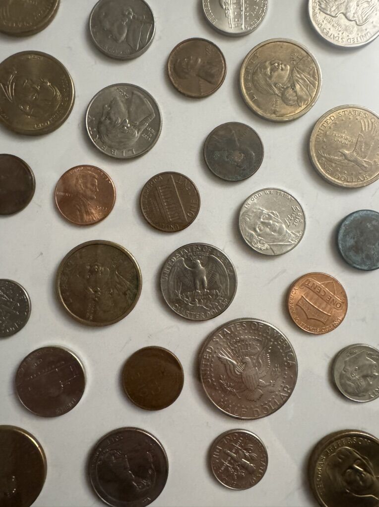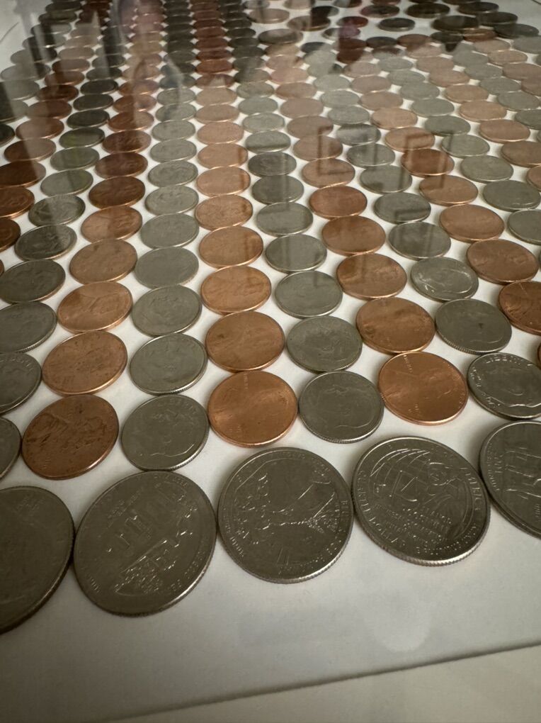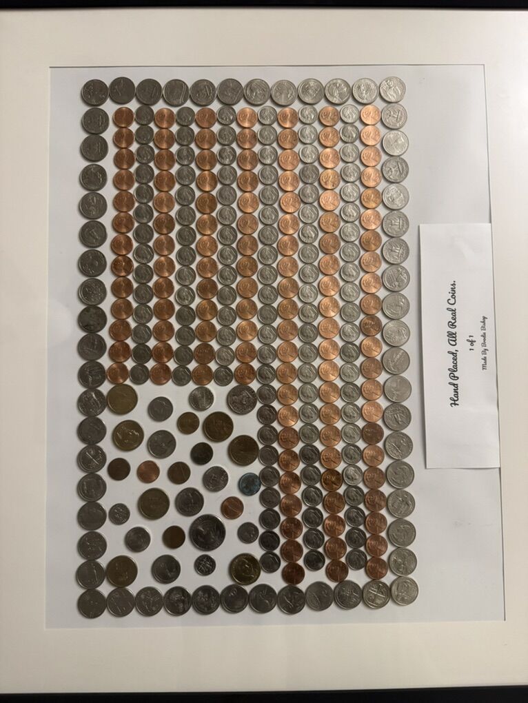 VenmoThis unique piece of wall art features real U.S. coins hand-placed to form the American flag. Crafted with precision and pride, it took over 3 days to complete and includes dimes, nickels, and pennies arranged to represent the stars and stripes. Each coin was carefully aligned and mounted in a sleek wooden frame, making it a bold statement of patriotism and craftsmanship. Perfect for collectors, veterans, or anyone who loves America. Size: 19 by 22 inches Materials: U.S. coins, wood frame, white backing