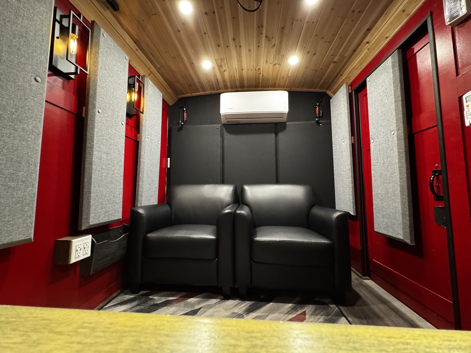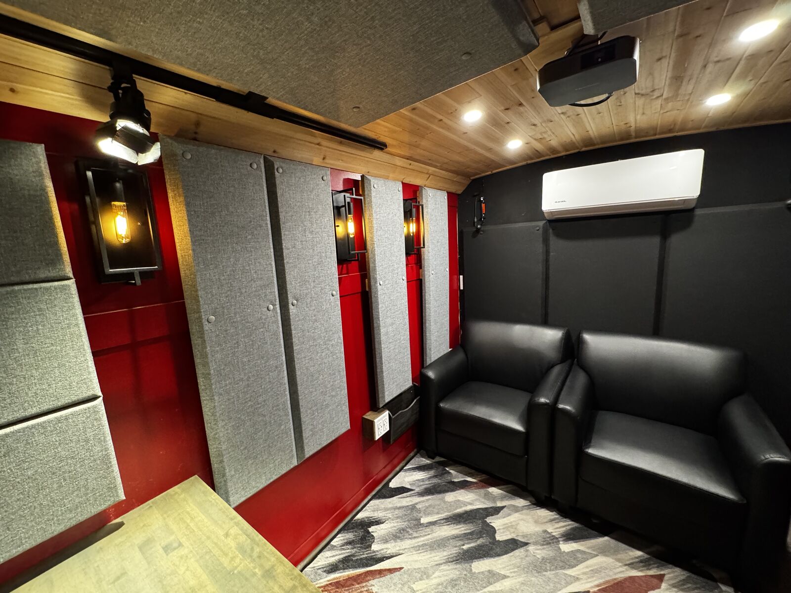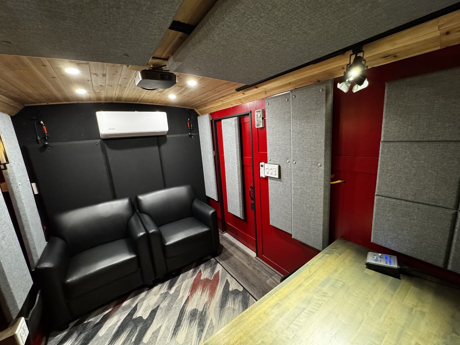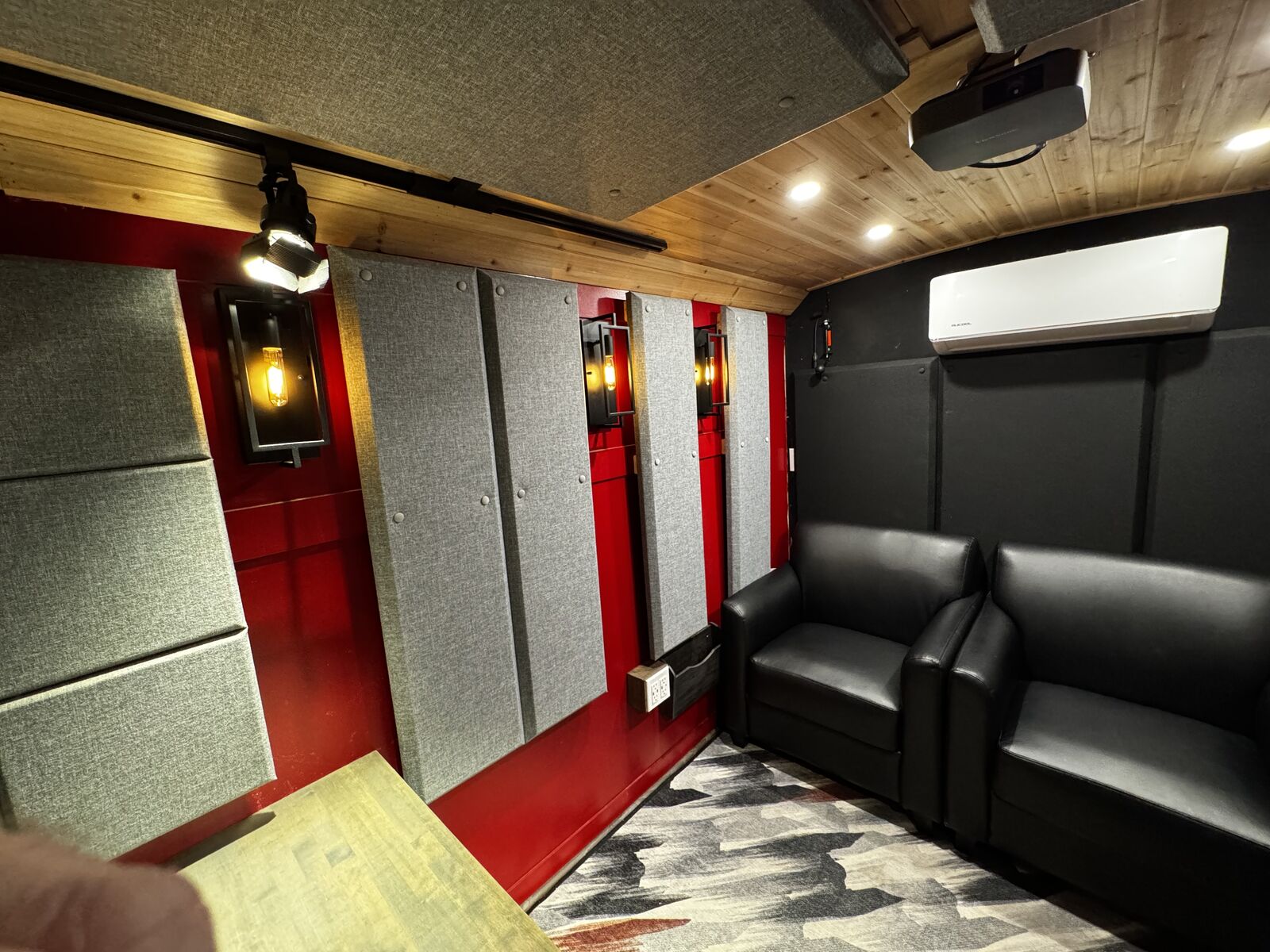 It features acoustically transparent fabric for the entire front wall with stereo speakers located behind. The speakers are included and feature two PreSonus Scepter 6" speakers and one PreSonus Temblor 8" sub. The speakers are wired through the sub using it's internal crossover. The trailer currently uses a PreSonus Central Station for speaker control. It is currently in a stereo setup but is wired for surround if you decide to update to a surround speaker controller. It also includes a T.C. Electronic Clarity M for metering. It is the surround variant but currently running in stereo off an AES/EBU input.