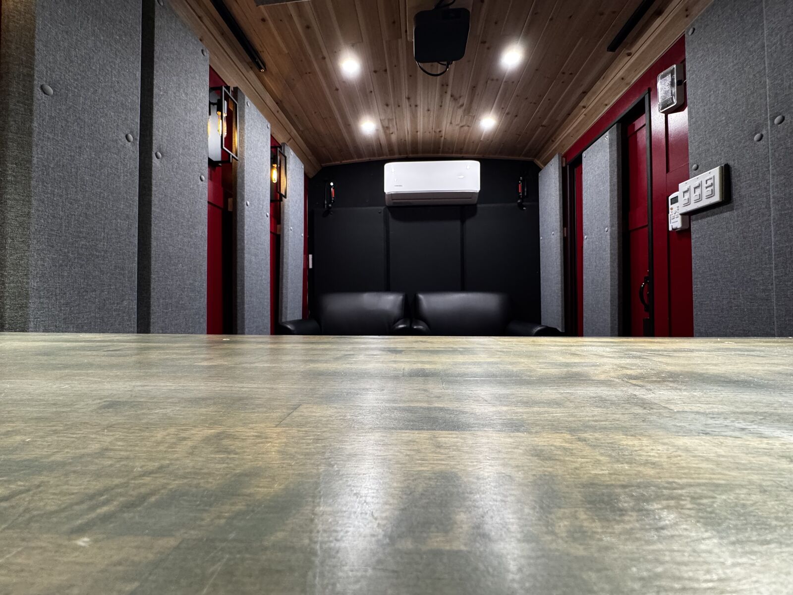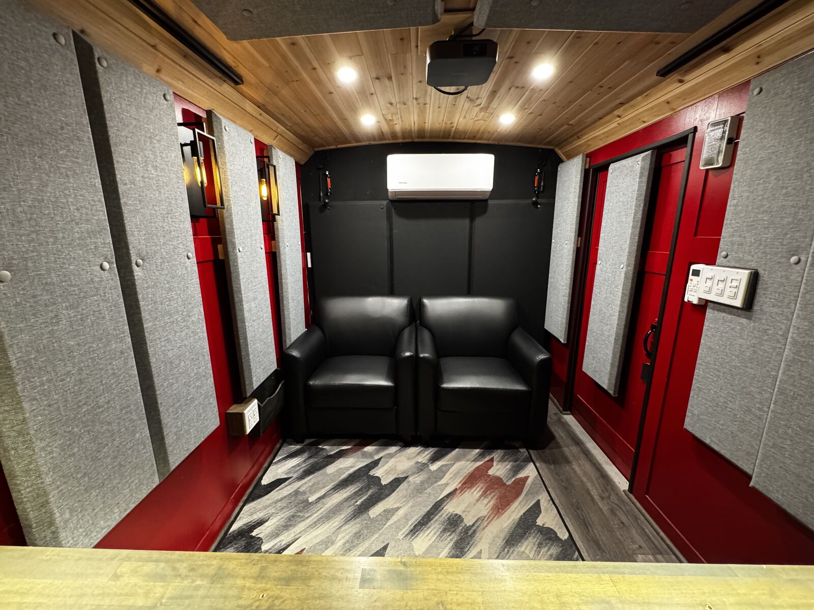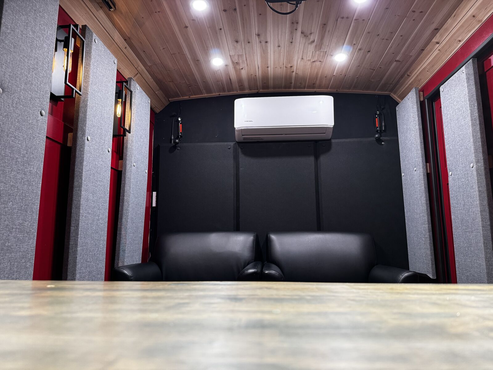It features acoustically transparent fabric for the entire front wall with stereo speakers located behind. The speakers are included and feature two PreSonus Scepter 6" speakers and one PreSonus Temblor 8" sub. The speakers are wired through the sub using it's internal crossover. The trailer currently uses a PreSonus Central Station for speaker control. It is currently in a stereo setup but is wired for surround if you decide to update to a surround speaker controller. It also includes a T.C. Electronic Clarity M for metering. It is the surround variant but currently running in stereo off an AES/EBU input.
