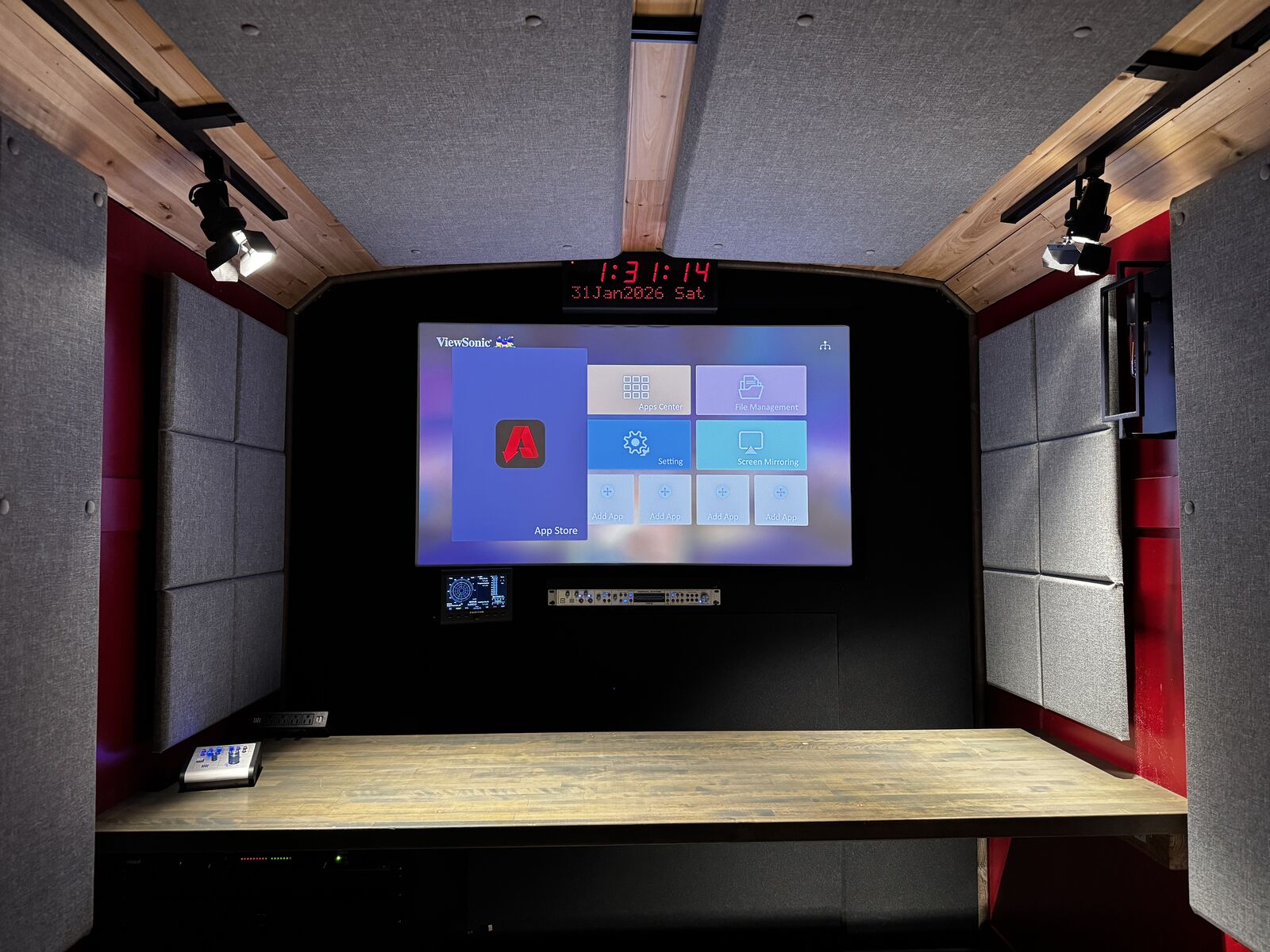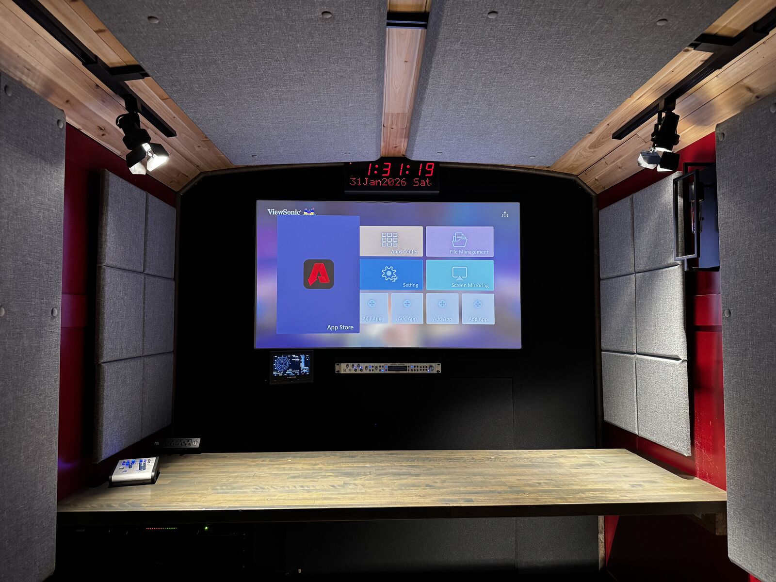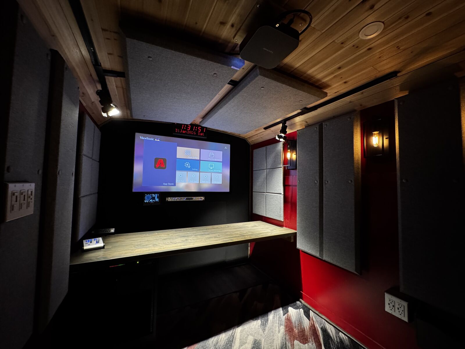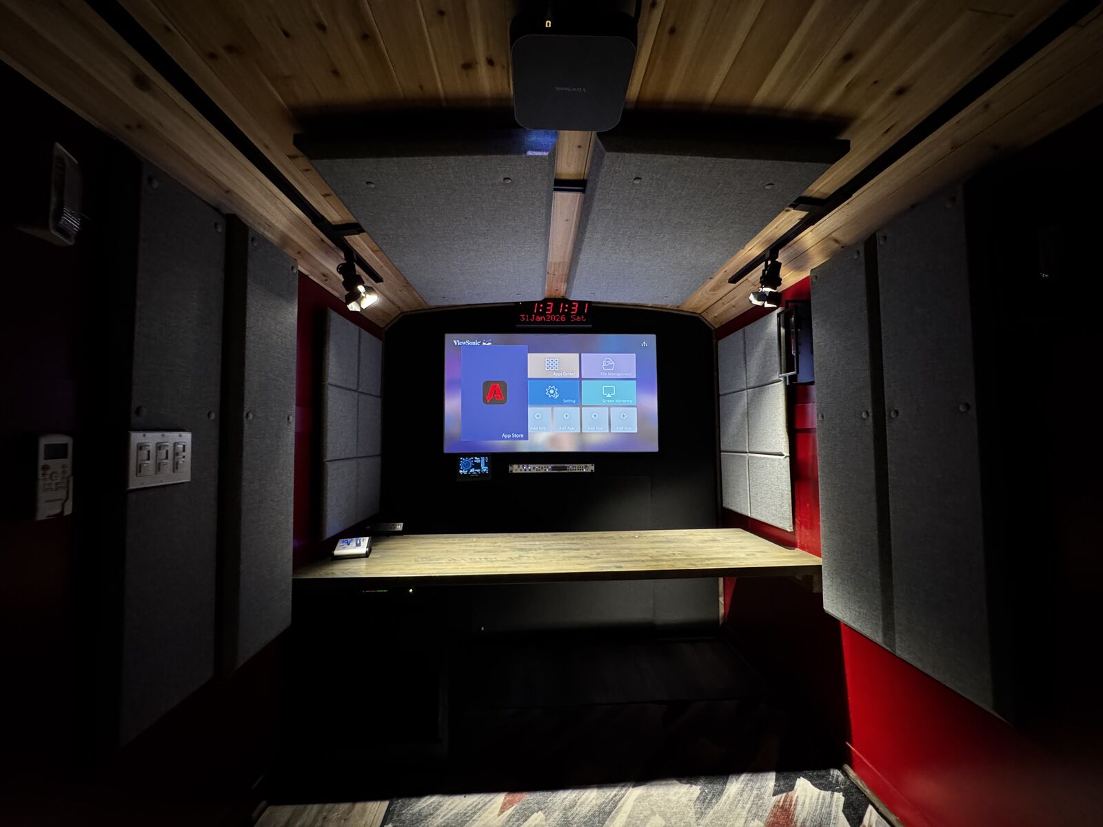It features acoustically transparent fabric for the entire front wall with stereo speakers located behind. The speakers are included and feature two PreSonus Scepter 6" speakers and one PreSonus Temblor 8" sub. The speakers are wired through the sub using it's internal crossover. The trailer currently uses a PreSonus Central Station for speaker control. It is currently in a stereo setup but is wired for surround if you decide to update to a surround speaker controller. It also includes a T.C. Electronic Clarity M for metering. It is the surround variant but currently running in stereo off an AES/EBU input.