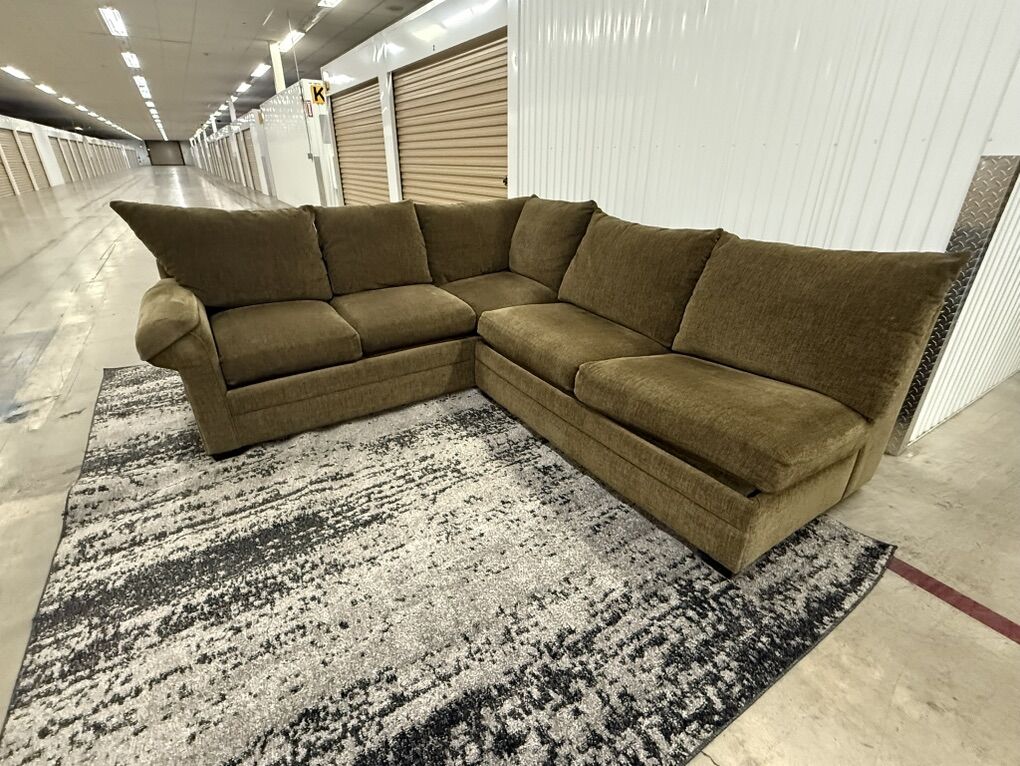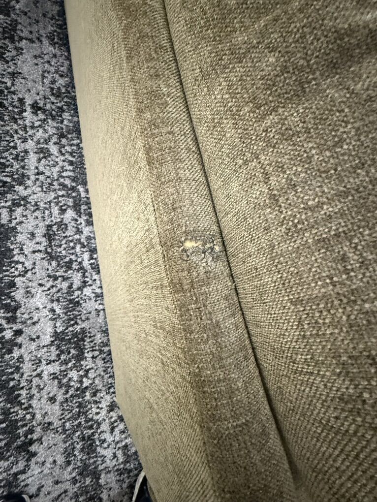 • Color: Earthy Olive Green / moss green. • Condition: Good. No visible damage. There are 2 small tears on the back, but against a wall is not noticeable. SEE PICS • Features: Deep seating, supportive back cushions, and a classic rolled arm on one side.