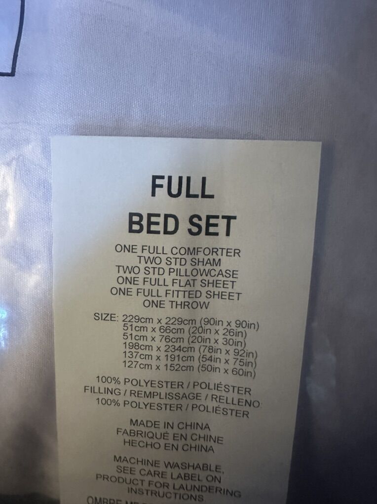 VenmoComforter And Shams Made Of 100% Polyester With Knife Edge Finish; SHEET SETs Made Of 100% Polyester, Throw Is Made Of 100% Ultra SOFT Plush Comforter, Shams And SHEET SET Are Brushed For Extra Softness; Made With 100% Polyester Fill To Keep In Warmth; The Throw Blanket Is Not Only Lightweight But Provides Extra Warmth To Keep Your Body Cozy Whether Snuggled Up On The Couch Or Adding That Extra Layer On Your Bed Comforter Has 6 5 Oz Polyester Fill; Throw Reverses To Self Full Set INCLUDES: 1 Full Comforter, 2 Standard Shams, 1 Flat Sheet, 1 Fitted Sheet, 2 Standard Pillowcases And 1 Throw Blanket Full Comforter- 90L X 90W; Standard Sham-20L X 26W; Flat Sheet- 92L X 78W, Fitted Sheet- 75L X 54W; Standard Pillowcase-20L X 30W; Throw- 60L X 50W Ke