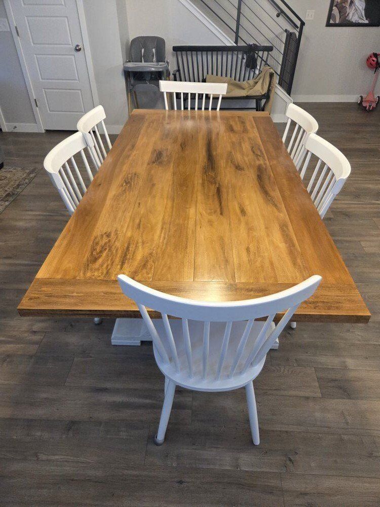 VenmoI made this farmhouse style dining room table out of poplar when we moved into our house about 6 years ago. Its L83-1/2" x W41-1/4" x H29" and about 1.5" thick. The stain and seal are in excellent shape the base could use a touch up of white paint if it bothers you. Im not sure what to charge for this so please make an offer it was about 600 in material when I built it and then my time. Im asking 450 obo. text if best and please feel free to ask questions. no delivery but I'll help load it as its quite heavy. Top and base come apart with screws. Ill throw the chairs in for free aswell but they are not very nice.
