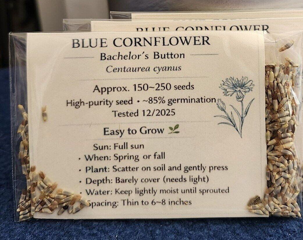 VenmoHey garden friends I’ve got hand-packed blue cornflower seeds ready to plant. These are one of my favorite easy, forgiving outdoor flowers. They're great for beginners and so pretty once they bloom. Each packet has a generous scoop (about 150–250 seeds) and comes with a printed care card. Full sun, scatter and lightly press. Keep moist until they sprout. Pollinators love them.