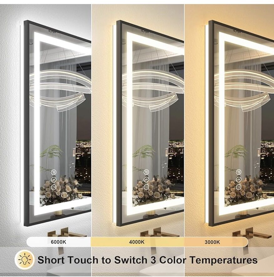 50x40 Black Lighted Mirrors for Bathroom Wall, Framed LED Bathroom Mirror, Defogger, Dimmable, Shatterproof, Memory, 3 Colors, ETL Listed (Front Light and Backlit)
