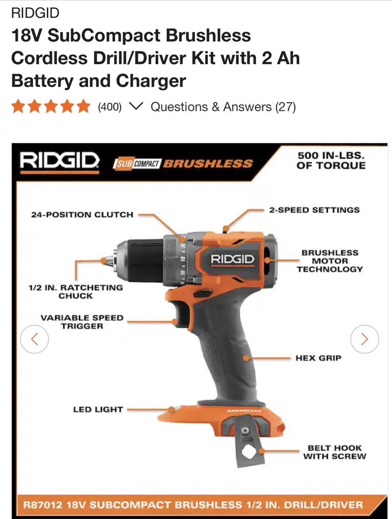 VenmoBrand New Ridgid subcompact brushless drill Lightweight design model #R87012K1 $149+ tax in home Depot Se habla español