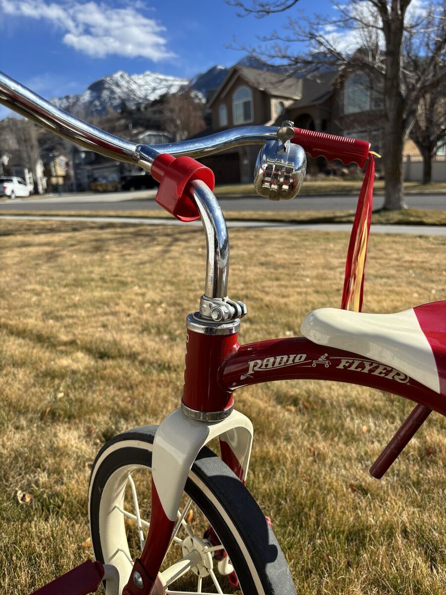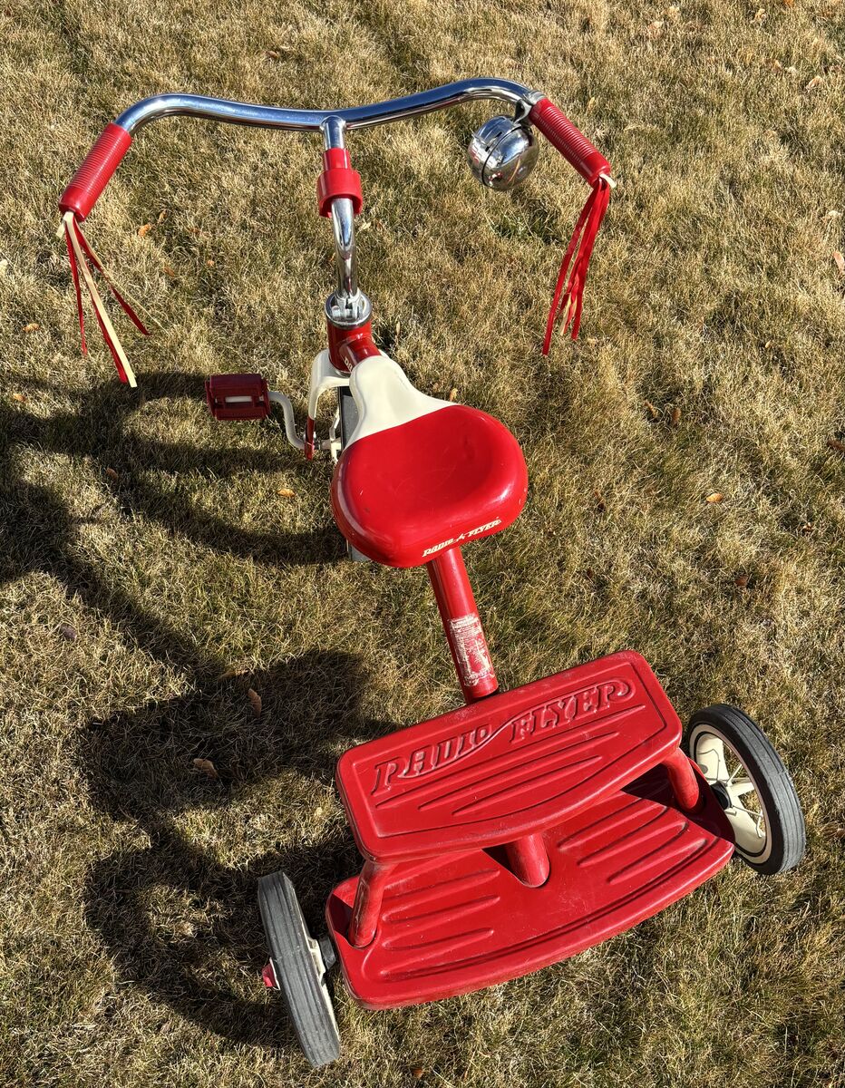 ZelleClassic red Radio Flyer dual deck tricycle in good condition. Durable steel frame with 12” front wheel, designed for young riders learning to pedal. Has an adjustable seat, real rubber tires, and a rear step that makes it easy for kids to get on and off. Includes chrome handlebars and fender, plus a bell and streamers.