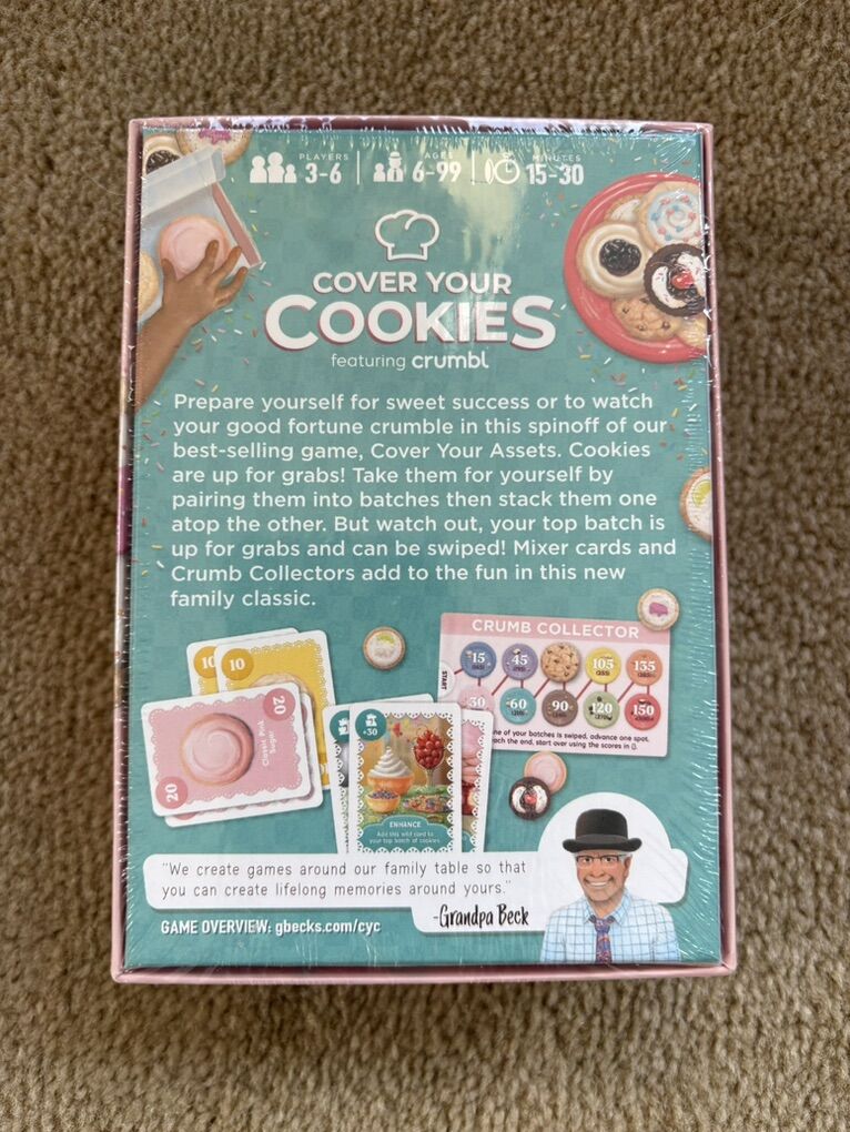 NEW (sealed in plastic) Cover Your Cookies: Crumbl Edition. Sweetly frosted revenge! A spinoff of Grandpa Beck’s beloved Cover Your Assets game. 2022. 3-6 players, ages 6+. New, unopened condition. Text only. Cash or Venmo.