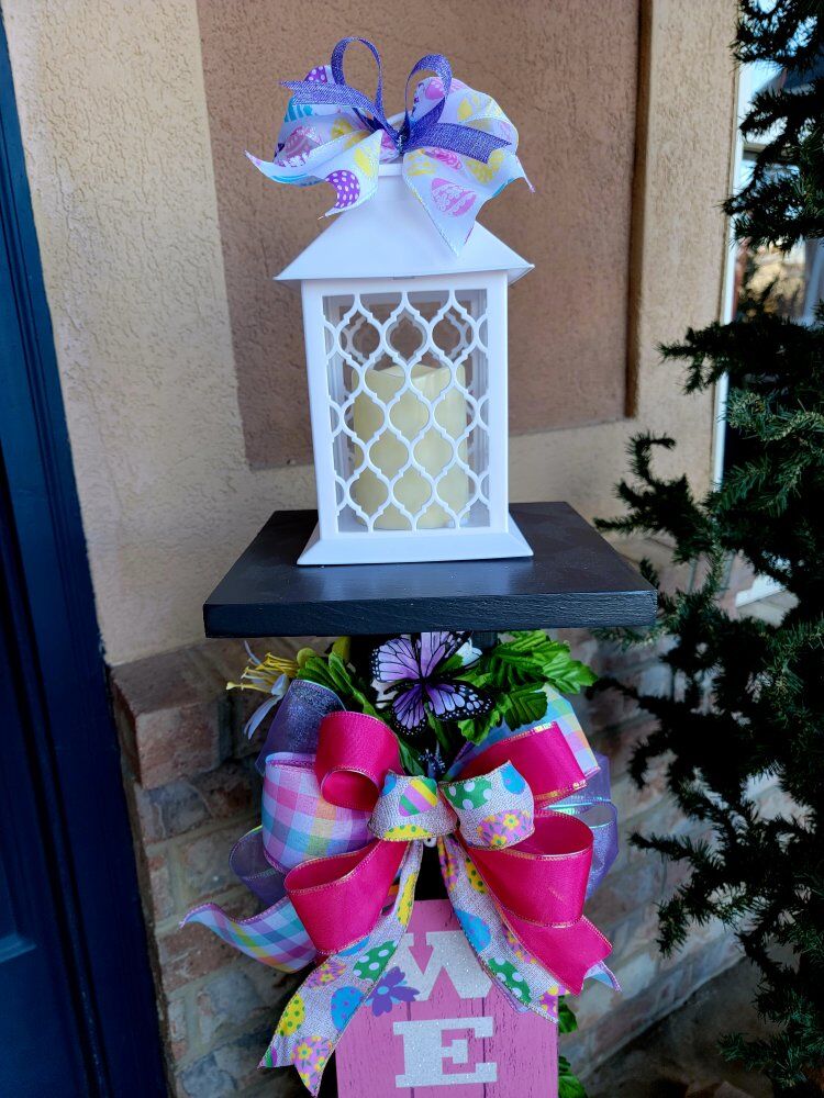 What's included: • Solid wood post construction with exterior black/white painted finish • Cast iron decorative hook (Vintage Style) • Holiday/Seasonal Sign or Wreath • Lighted Lantern Topper/Fixture- Batteries Included • Decorative bows and garland (Bows may be different than pictured) • Ready to display right now