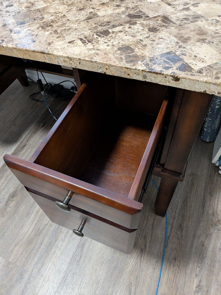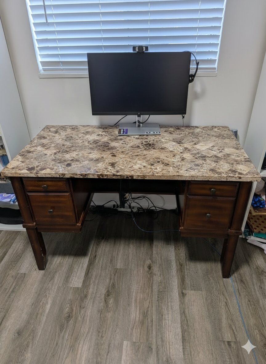 PayPalBeautiful marble top desk, mainly used as an office desk. Wood and marble in good condition with 3 drawers but is missing the middle top drawer. Monitor for reference but can fit up to 3. Desk is very heavy due to the wood and marble