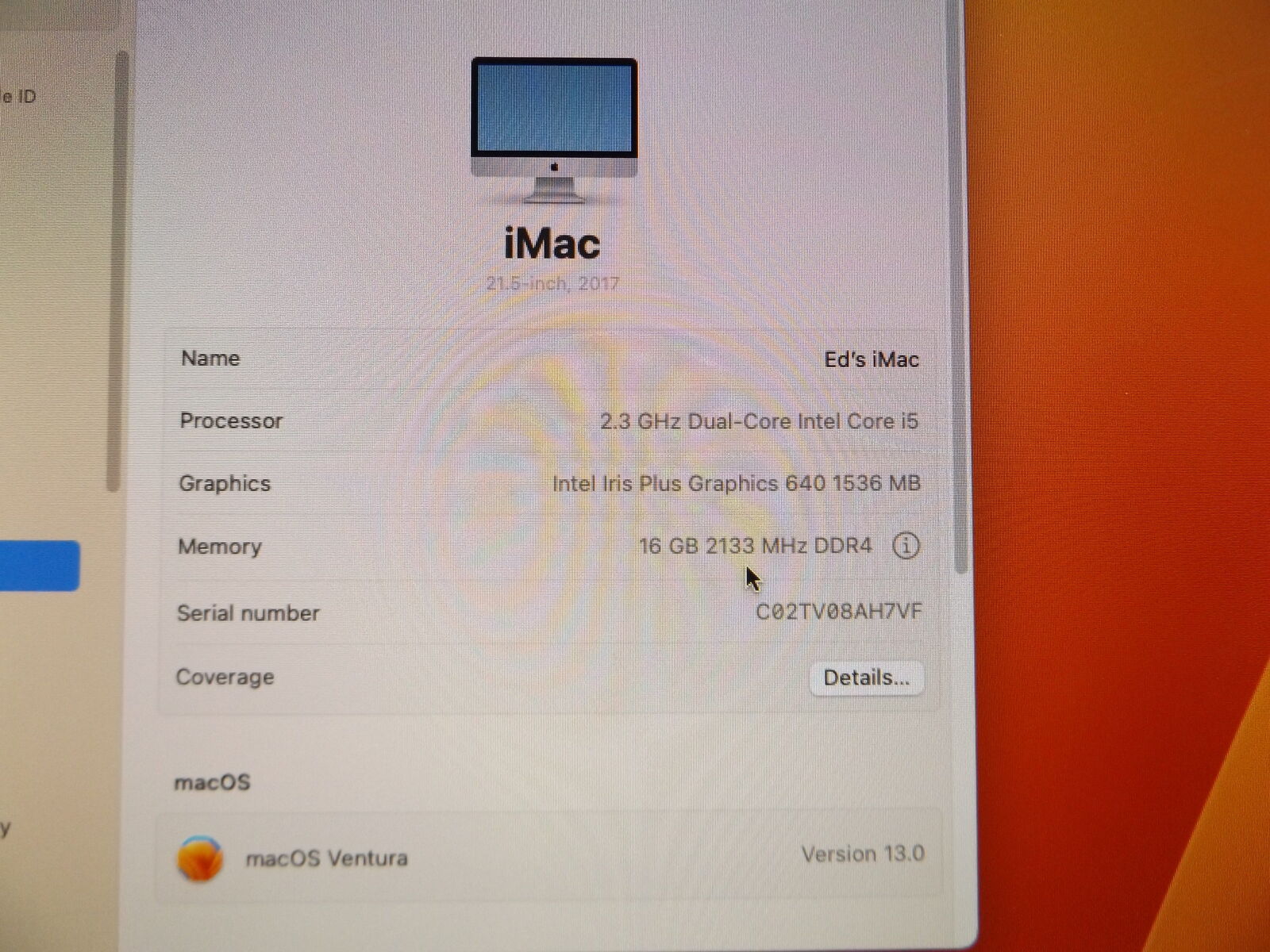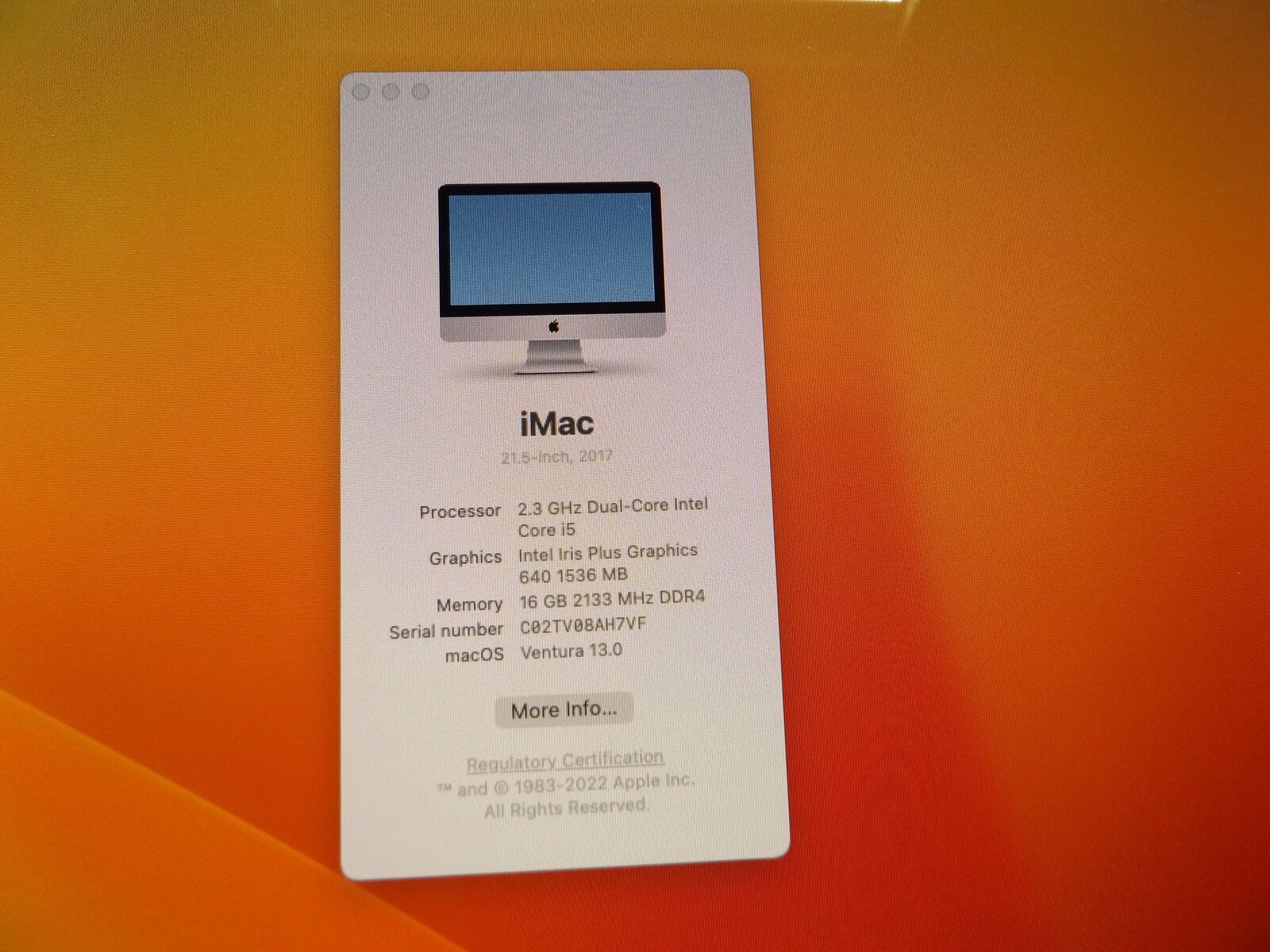 VenmoFor sale an used iMac 21.5" Ventura 13.0 Model A1418 EMC 3068 2.3Ghz i5 16Gb 1TB HD 2017 Working.