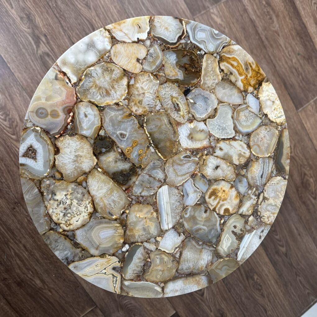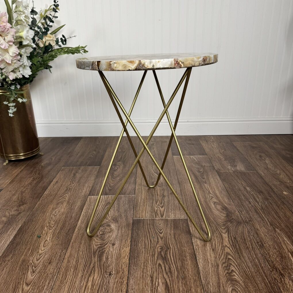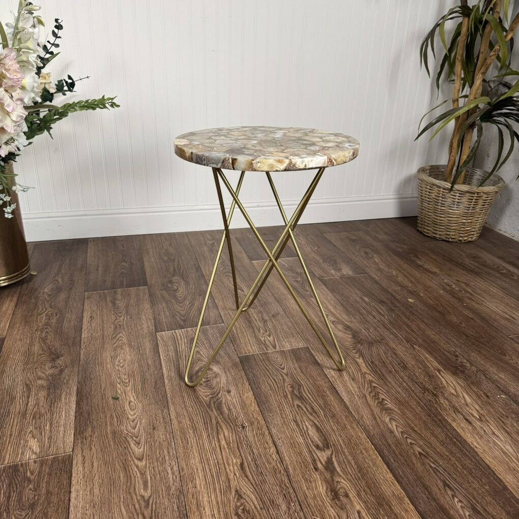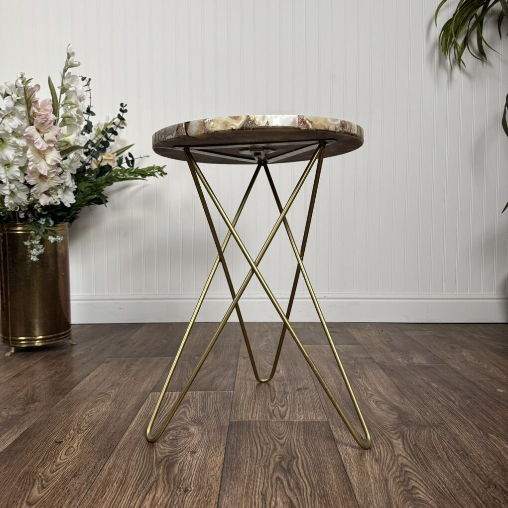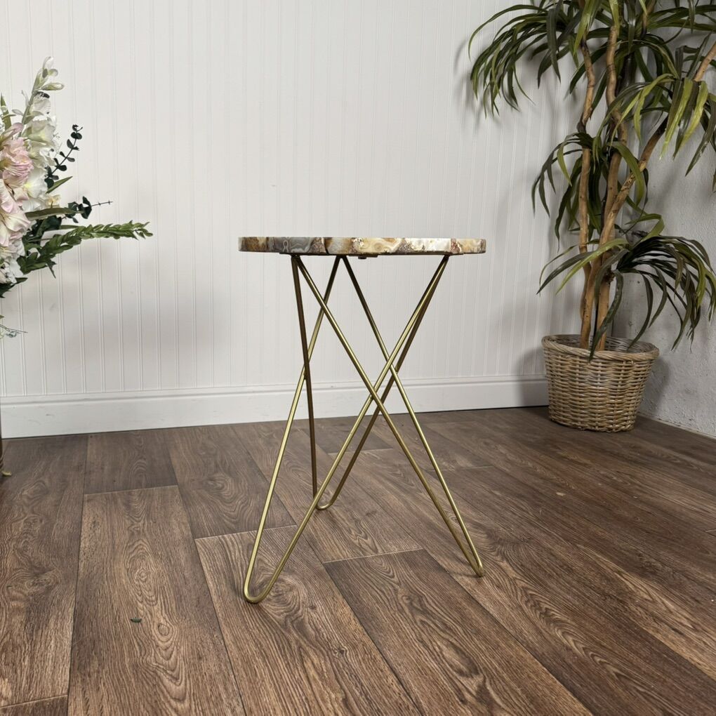VenmoBeautiful contemporary accent table featuring an agate-style mosaic resin top and sleek brass-color hairpin legs. Perfect as an end or side table, plant stand, or accent table. Good condition.
