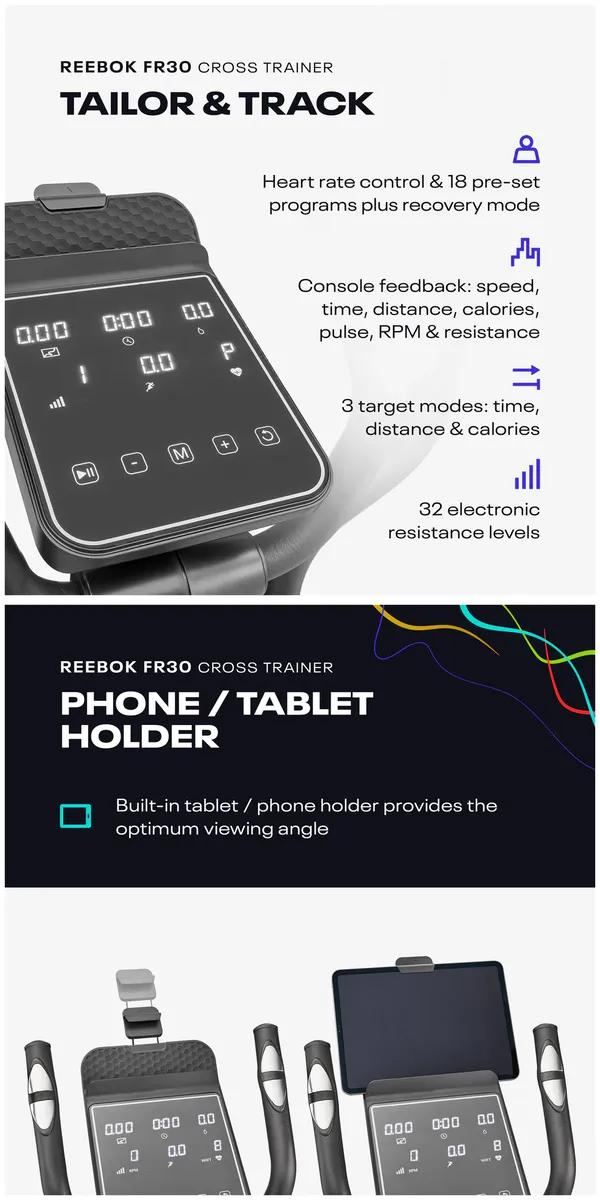 See more info at https://reebokfitnessequipment.com/collections/cross-trainers/products/reebok-fr30-elliptical-cross-trainer