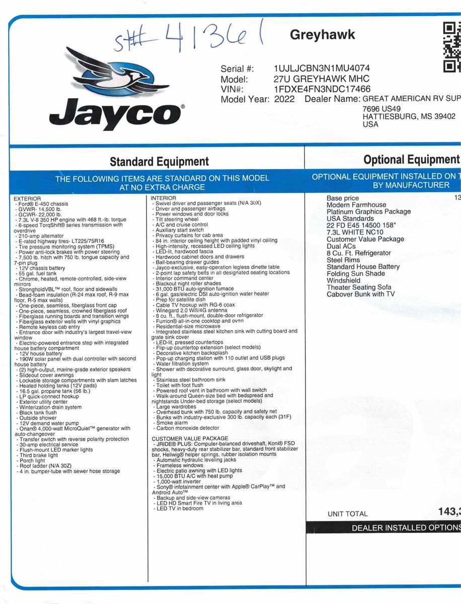 We are looking to sell our motorhome, not because we don't enjoy it, but because we downsizing as we get closer to a cross country move. The build sheet is attached in the pictures and this motorhome is all you will need to enjoy many years of traveling fun. What I learned/changed is, when you buy one new, they are dangerous to say the least. We were getting blown off the road by every semi or box truck we passed or they passed us. The JRIDE Plus system that is factory installed does tighten up the back end of the motorhome, but the front would walk all over the place. I installed a beefed up Hellwig sway bar in the front and complimented it with a Road Master steering stabalizer. This removed the stock steering dampner and truly made this a one hand driving experience. Furthermore, we have multiple warranties that are still in effect. The warranties are transferrable for minor fees. Please come take a look if you're interested. Thanks