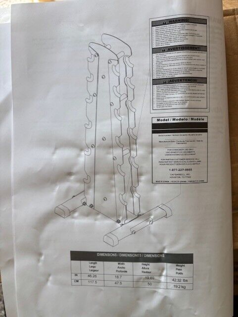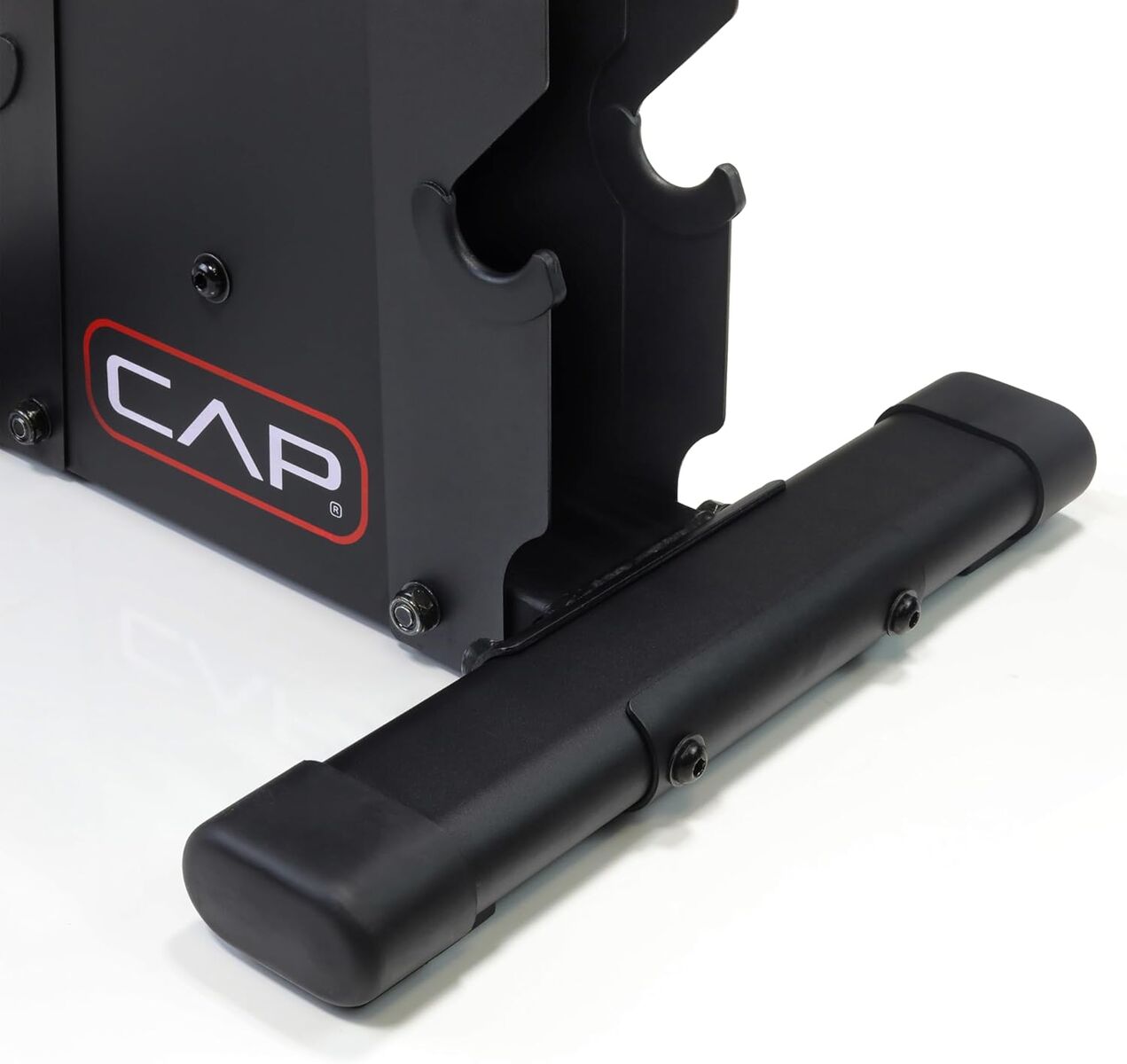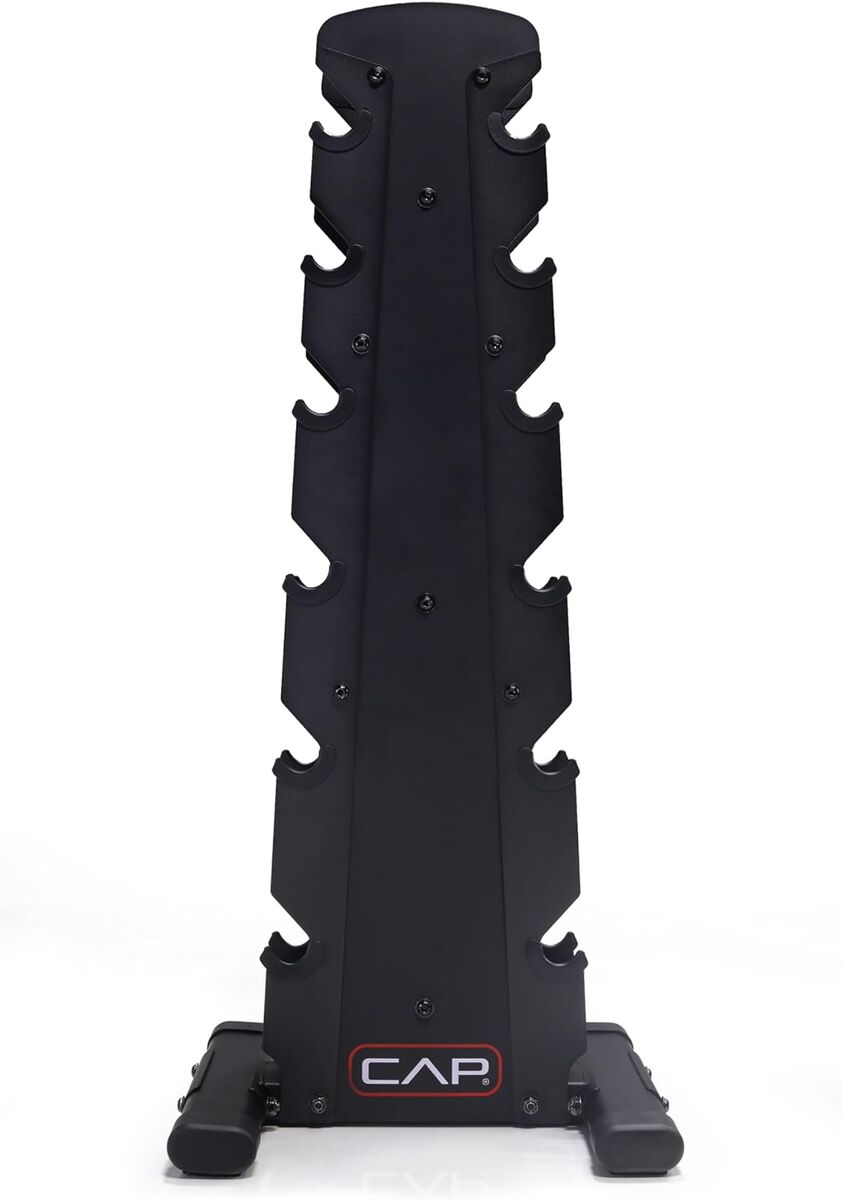 Holds 210 pounds - Designed to hold 6 pairs of CAP Bbarbell hex or rubber hex dumbbells ranging from 5 to 30 pounds; Mix and match your dumbbells to fit this rack, up to 35 pounds pairs; Some combinations may not fit