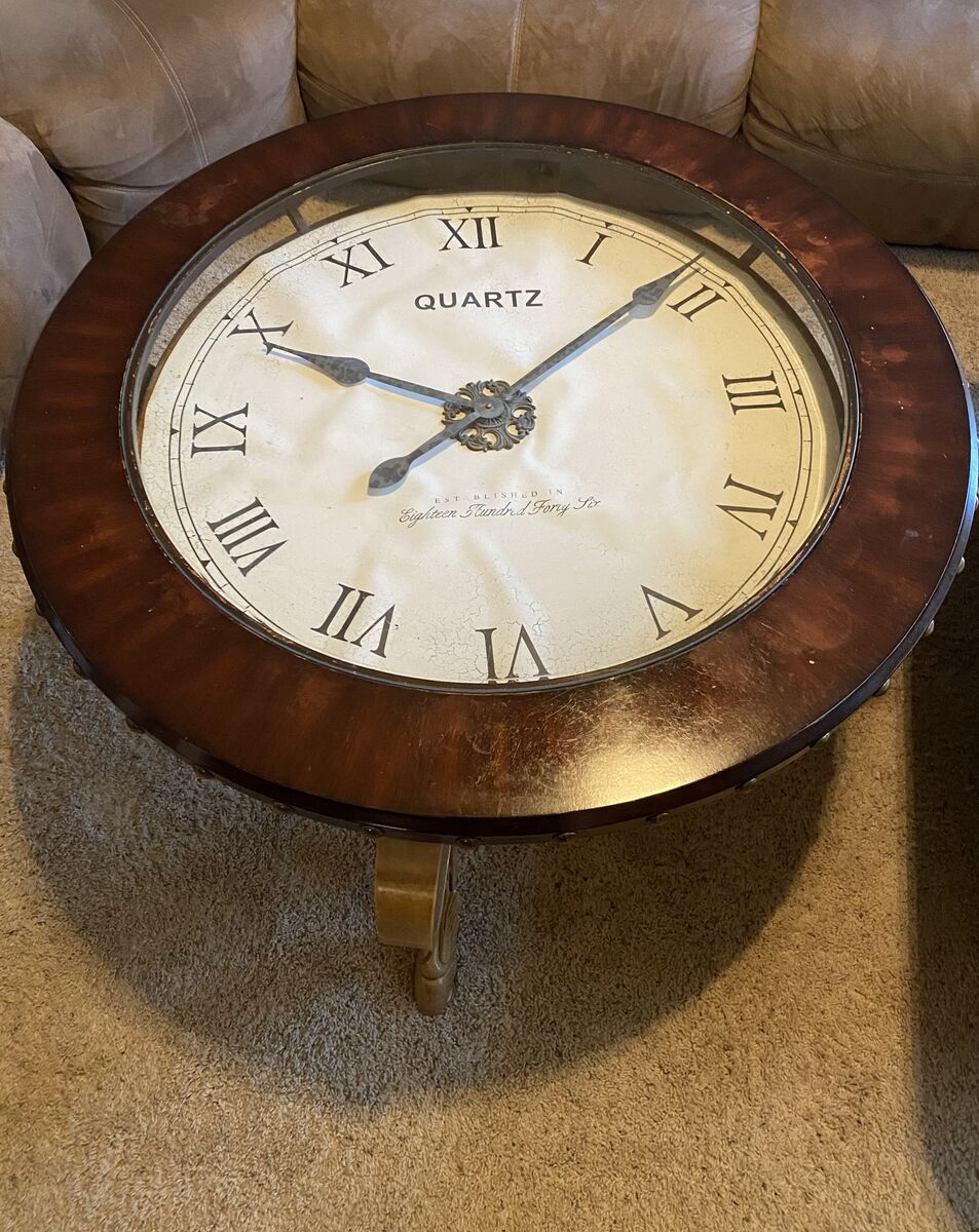 VenmoUnique round coffee table featuring a large decorative clock face beneath a glass top. The table has a wooden frame that needs some TLC, metal accents around the edge, and ornate metal legs with a rustic finish. The clock portion is non‑functional, but it still makes a great statement piece and can likely be fixed. The glass top is intact, and the table is sturdy with normal signs of use. Perfect for adding a touch of vintage charm to a living room, office, or sitting area. Great for anyone who loves distinctive furniture or DIY projects.