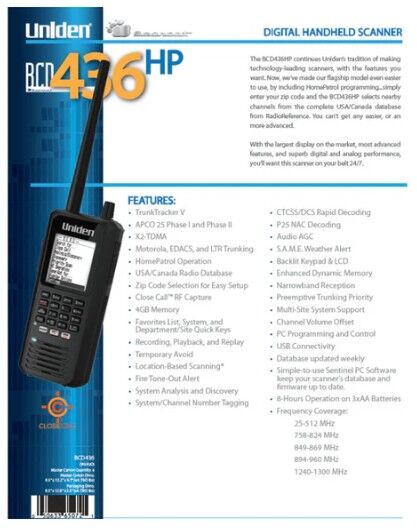 PayPalUniden BCD436HP HomePatrol Series Digital Handheld Scanner. TrunkTracker V, Simple Programming, S.A.M.E. Emergency/Weather Alert, Covers USA and Canada w/w Bianchi 7914S Universal Radio Holder with Swivel for the belt. I have owners manual in PDF form as well.