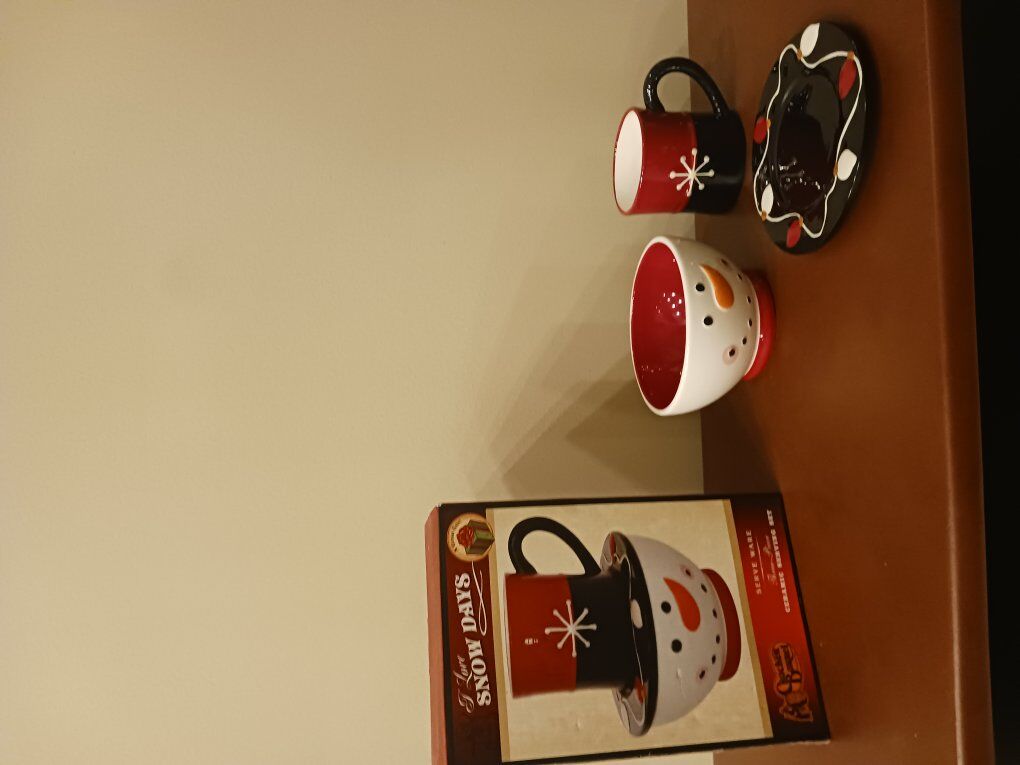 New in box. This bowl, cup and saucer stack up to make a snowman.