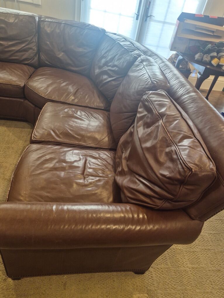 VenmoOur House Brand Fine Leather couch in fair condition. Our House is a top of the line brand and this couch originally sold for $11,000. Couch is worn in a couple of places with a few tears in cushion and armrest that can be repaired. Dimensions are 8.5 x 8.5x 3.5. Comes from a smoke free home.