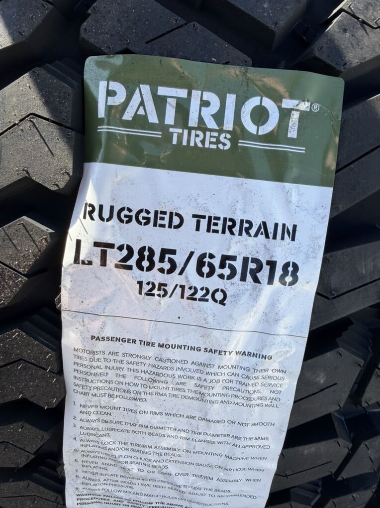 Tires are Patriot R/T 285/65R18 which is roughly 33x11x18 10 ply Load Range E 125 load rating