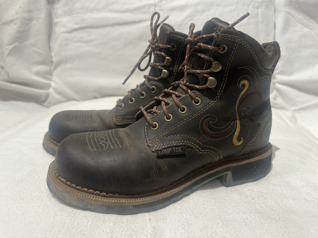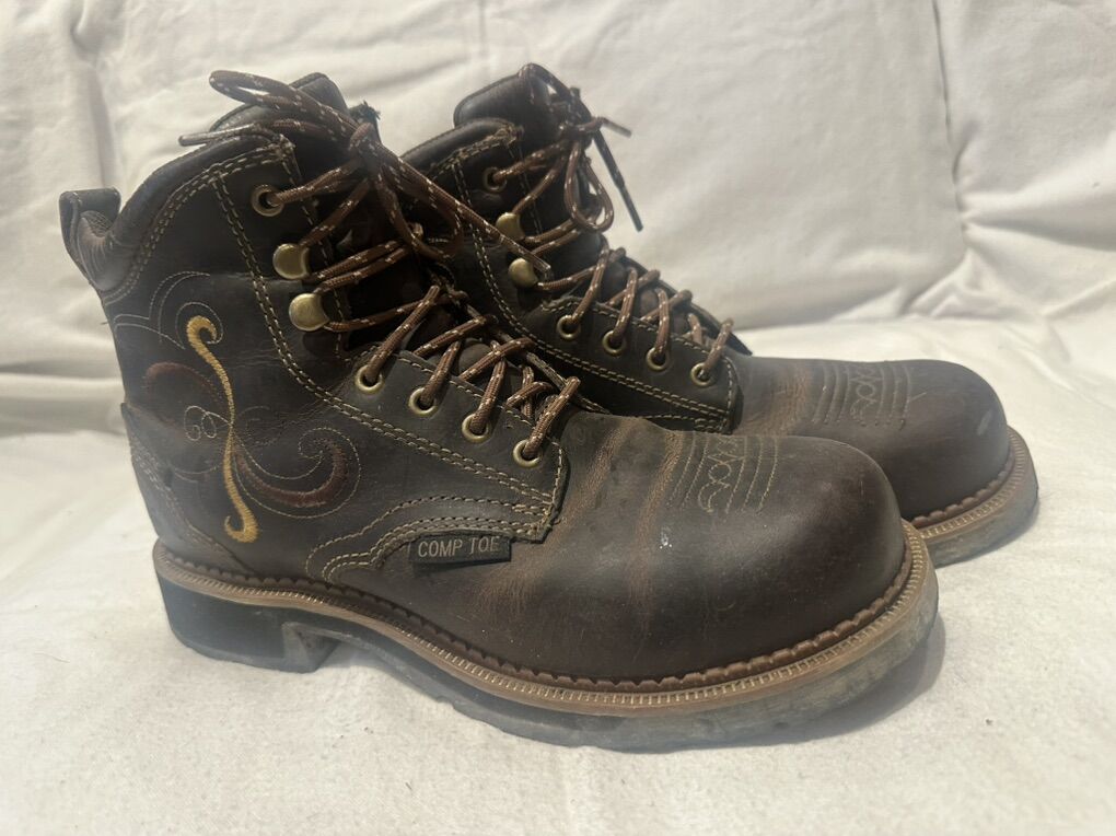Justin women’s size 7.5 brown leather waterproof work boots with embroidery and a composite toe and slip resistant soles. These are in excellent condition, see photos for details. I take cash or Venmo, but cash is preferred. Text is best. 801-201-4446. Check out my other ads for additional sizes and styles.